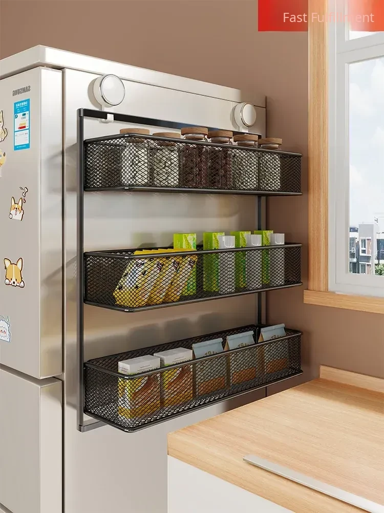 Multifunctional Suction Cup Kitchen Storage Rack - Wall-Mounted, No Drilling Required, Multi-Layer Spice Organizer for Refrigerator Side Storage