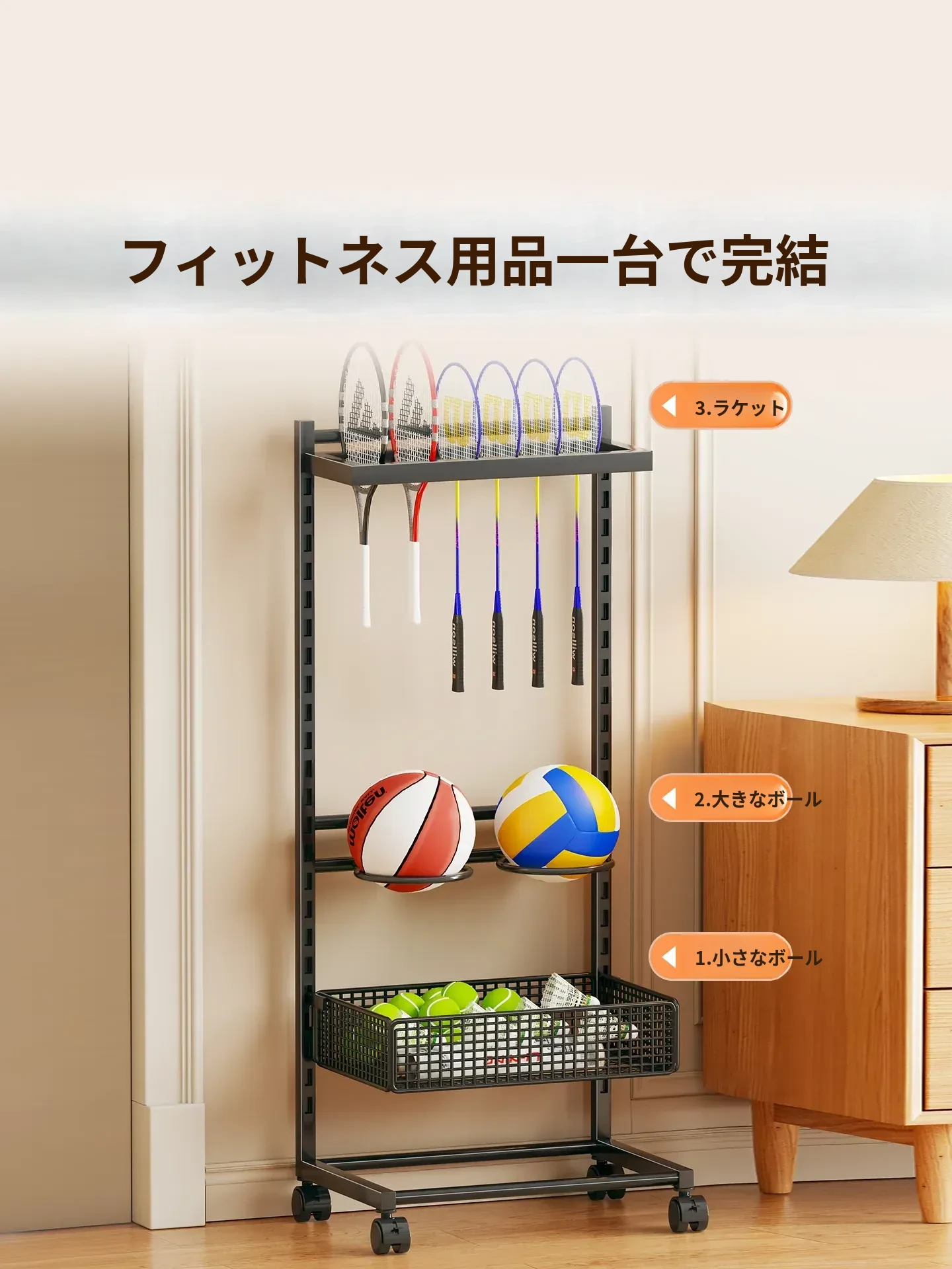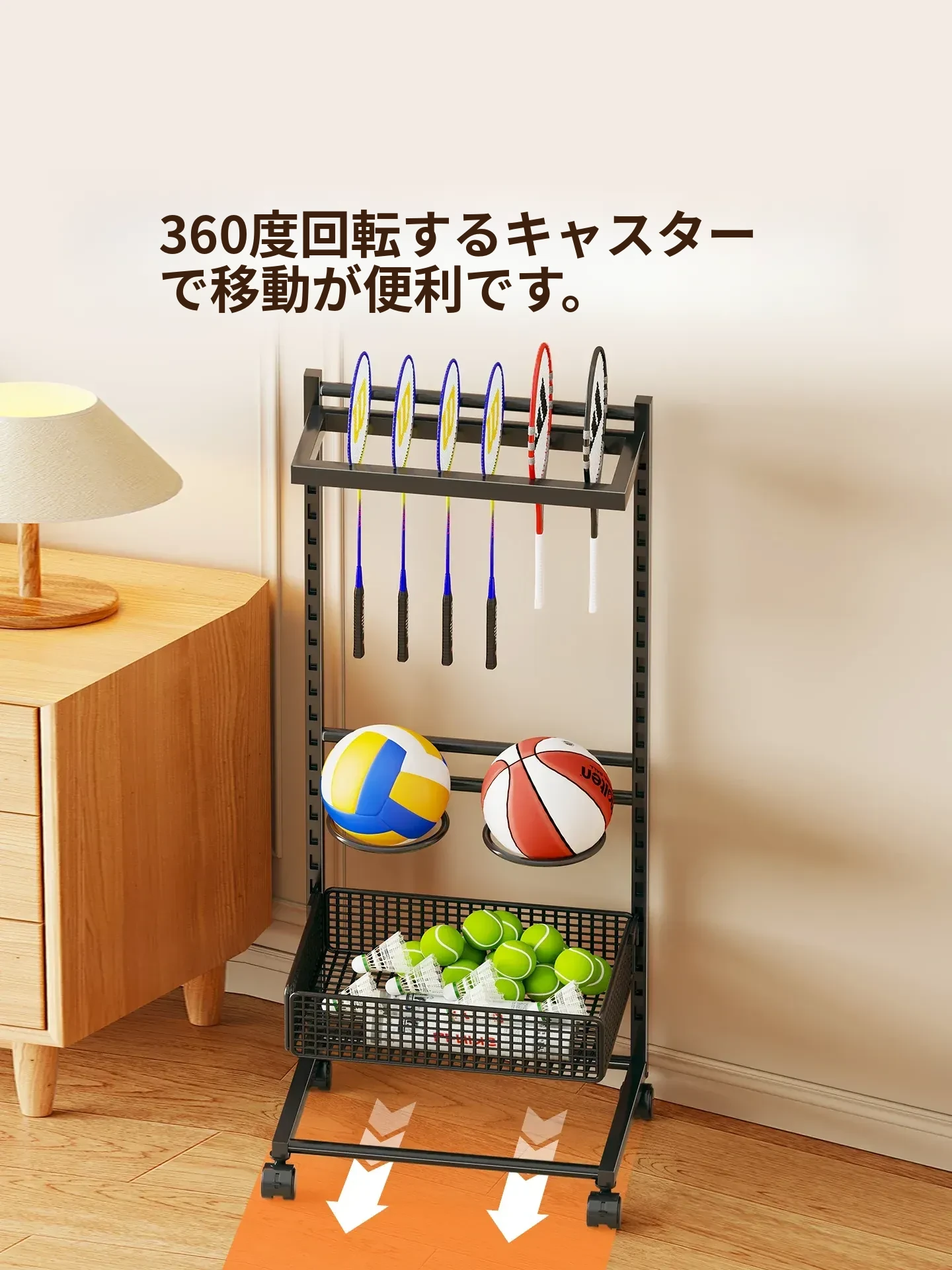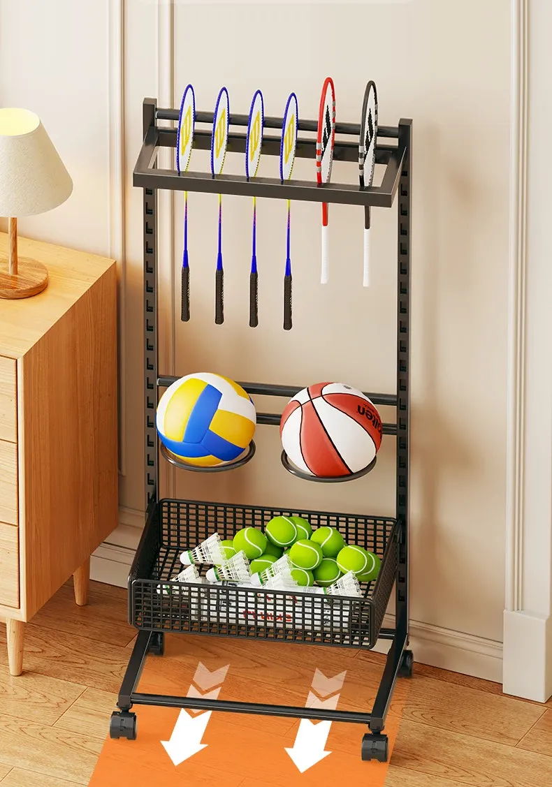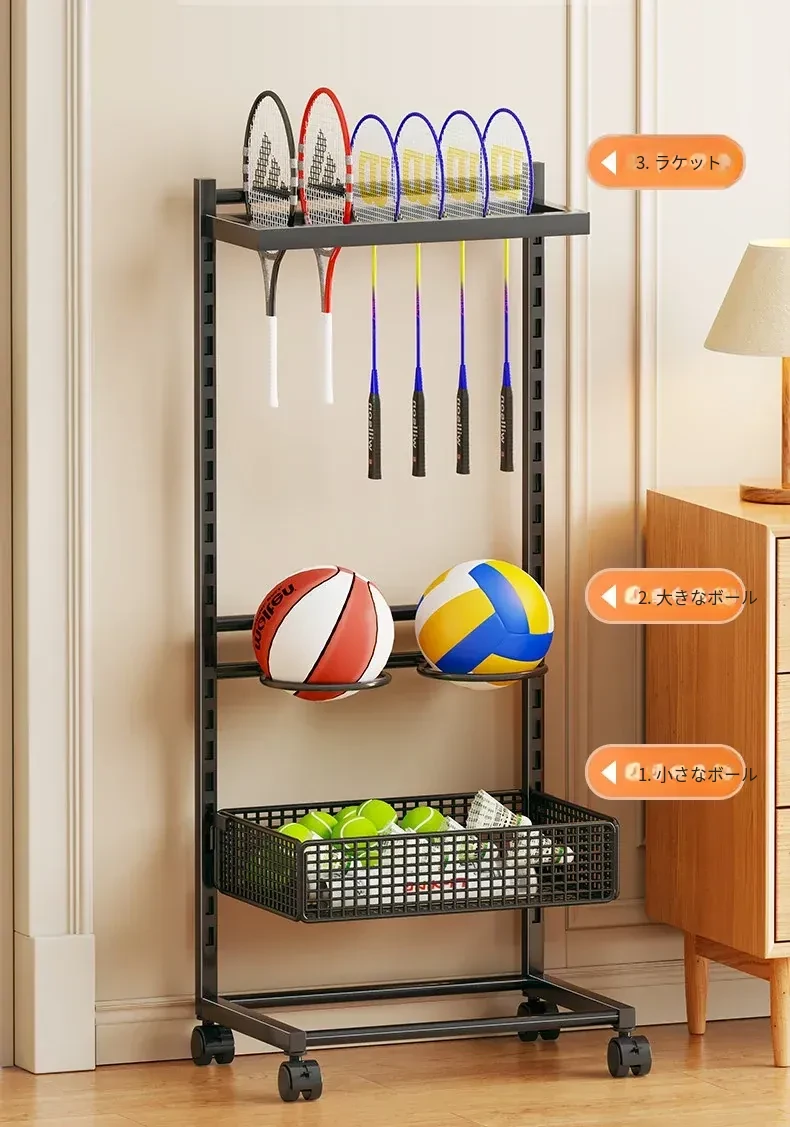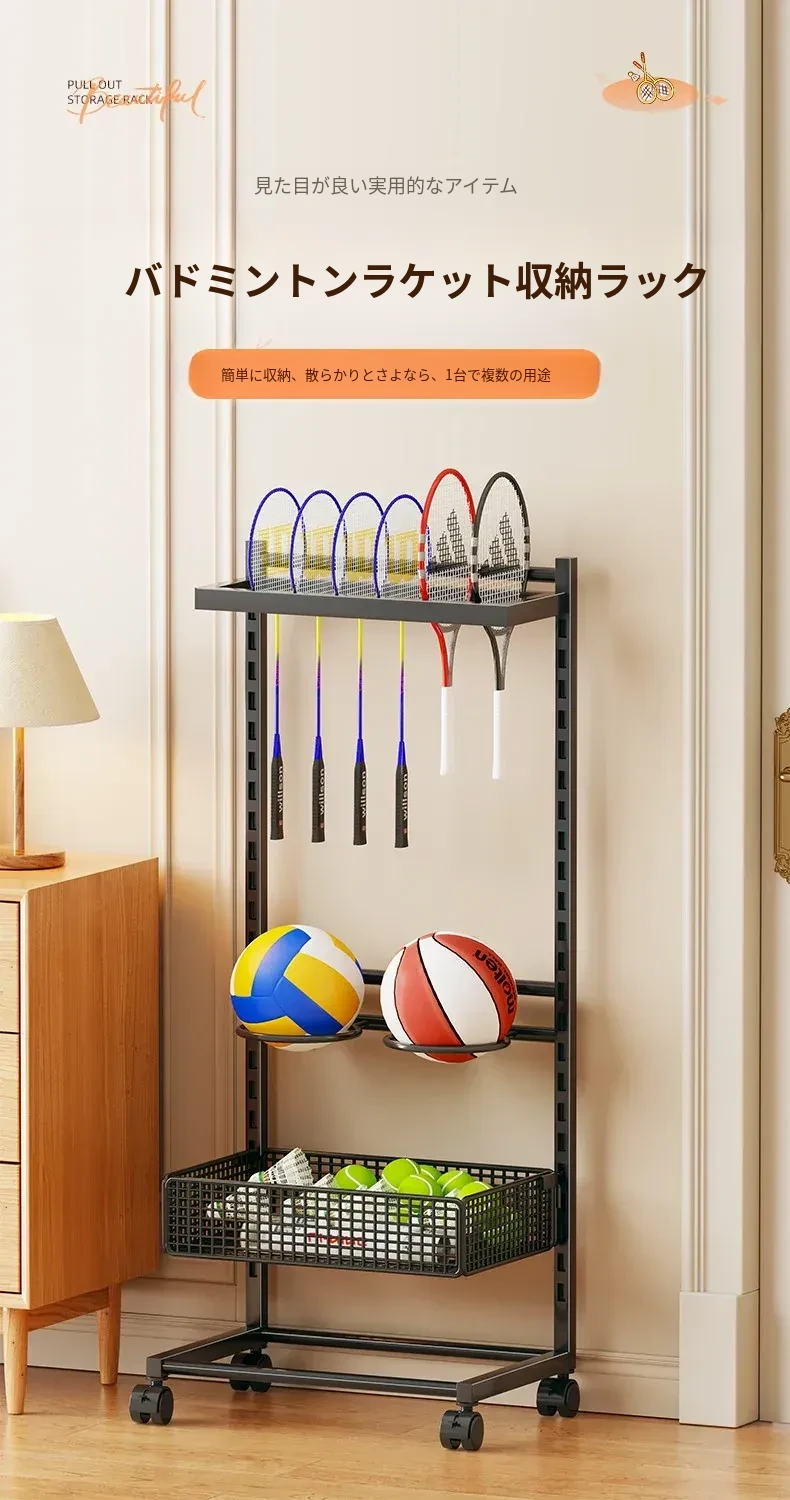 移動式バドミントンラケット収納ラック - 大容量で便利!キャスター付きで簡単に移動可能、バドミントンやテニスラケットの展示にも最適な収納スタンドです。あなたのスポーツライフをスタイリッシュにサポートします!