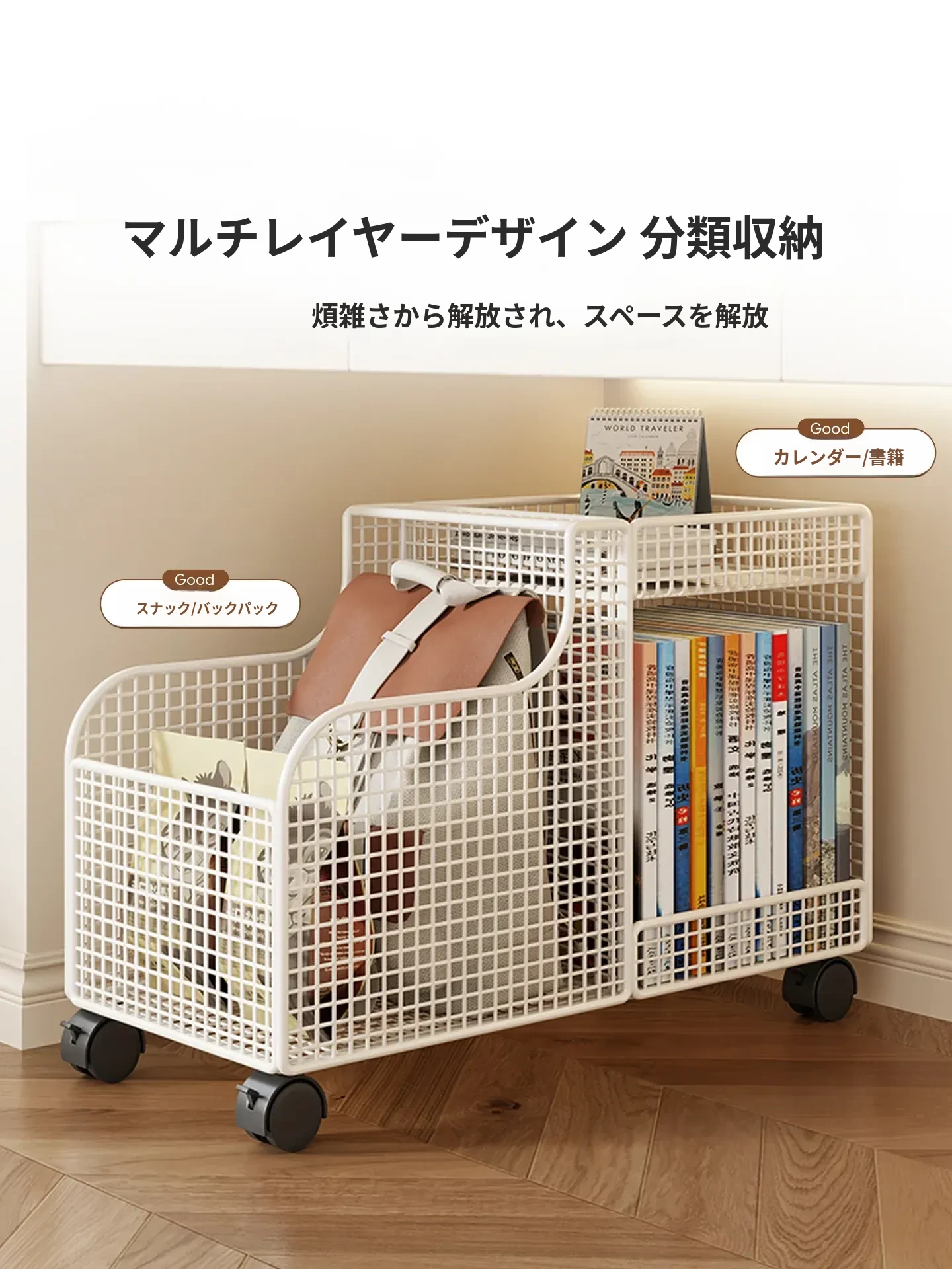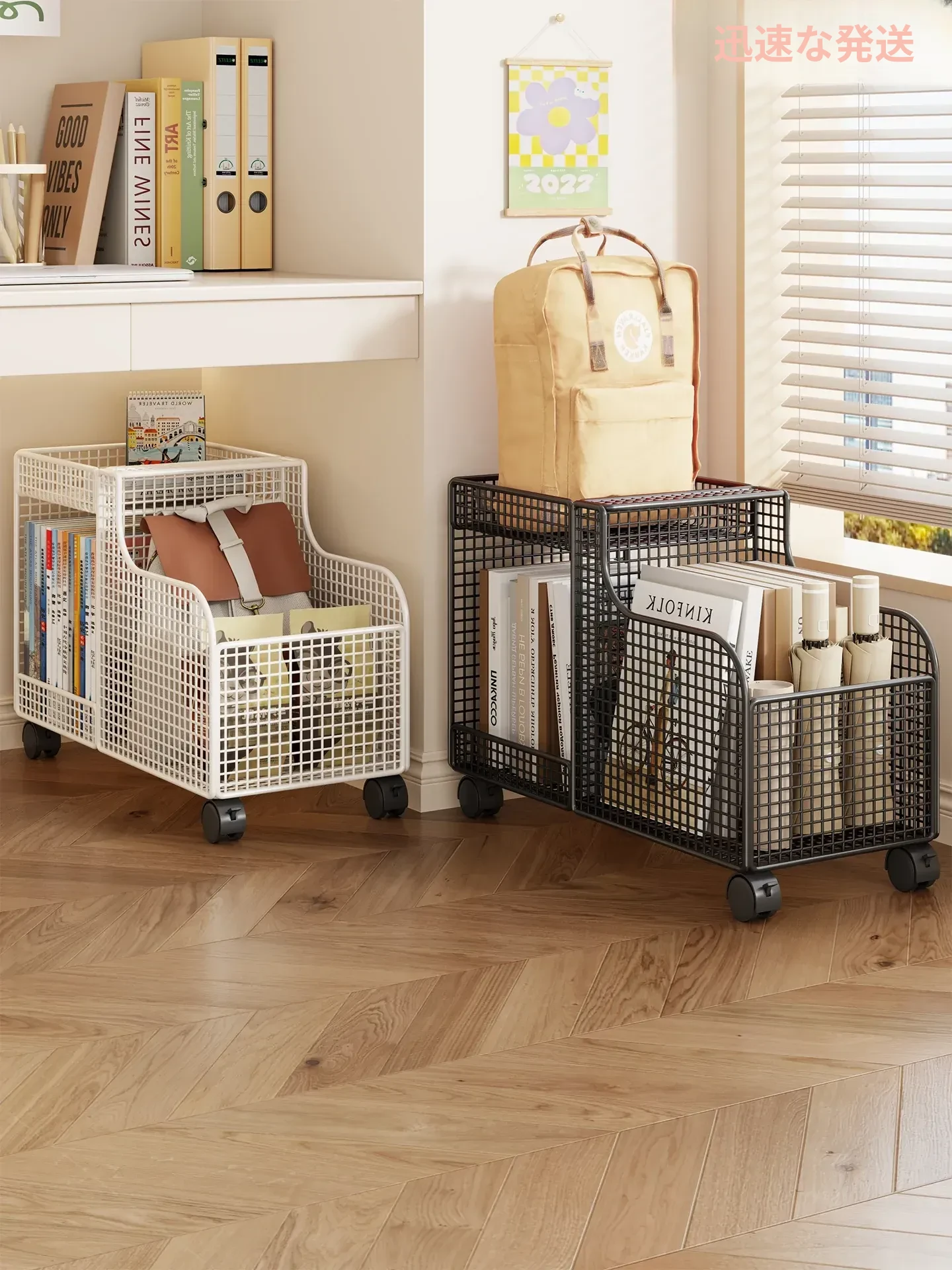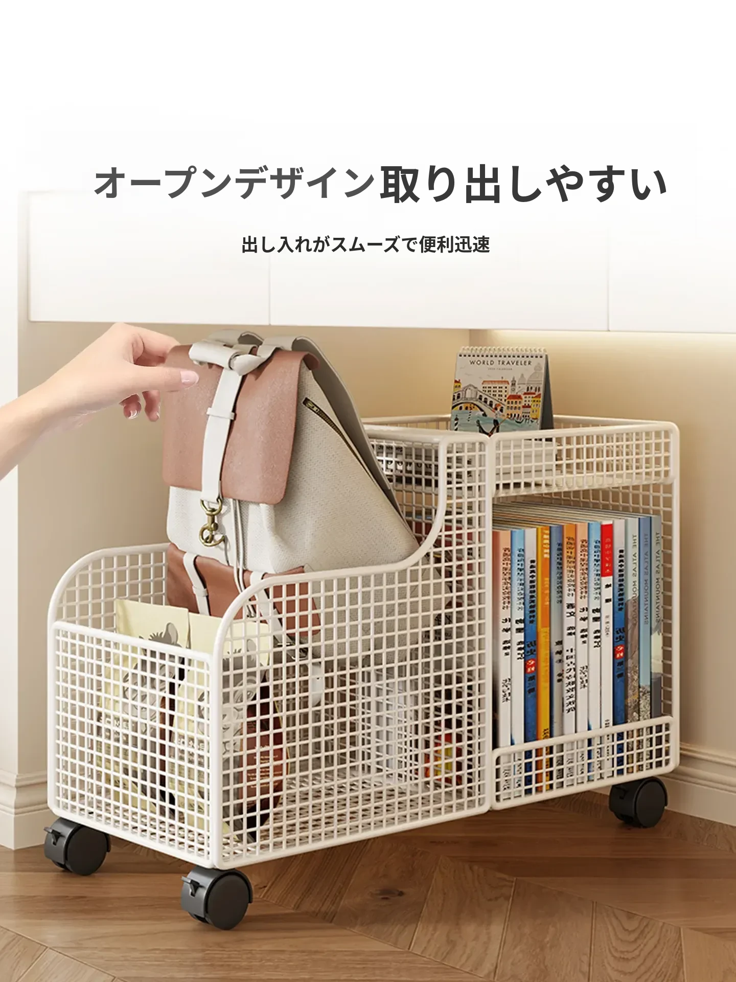 移動式ブックラック&収納キャリー!デスク下にぴったり収まる、便利な書籍収納スタンド。キャスター付きで簡単に移動可能!デスク周りをスッキリ整理、書籍やバッグをスマートに収納できる必需品です!