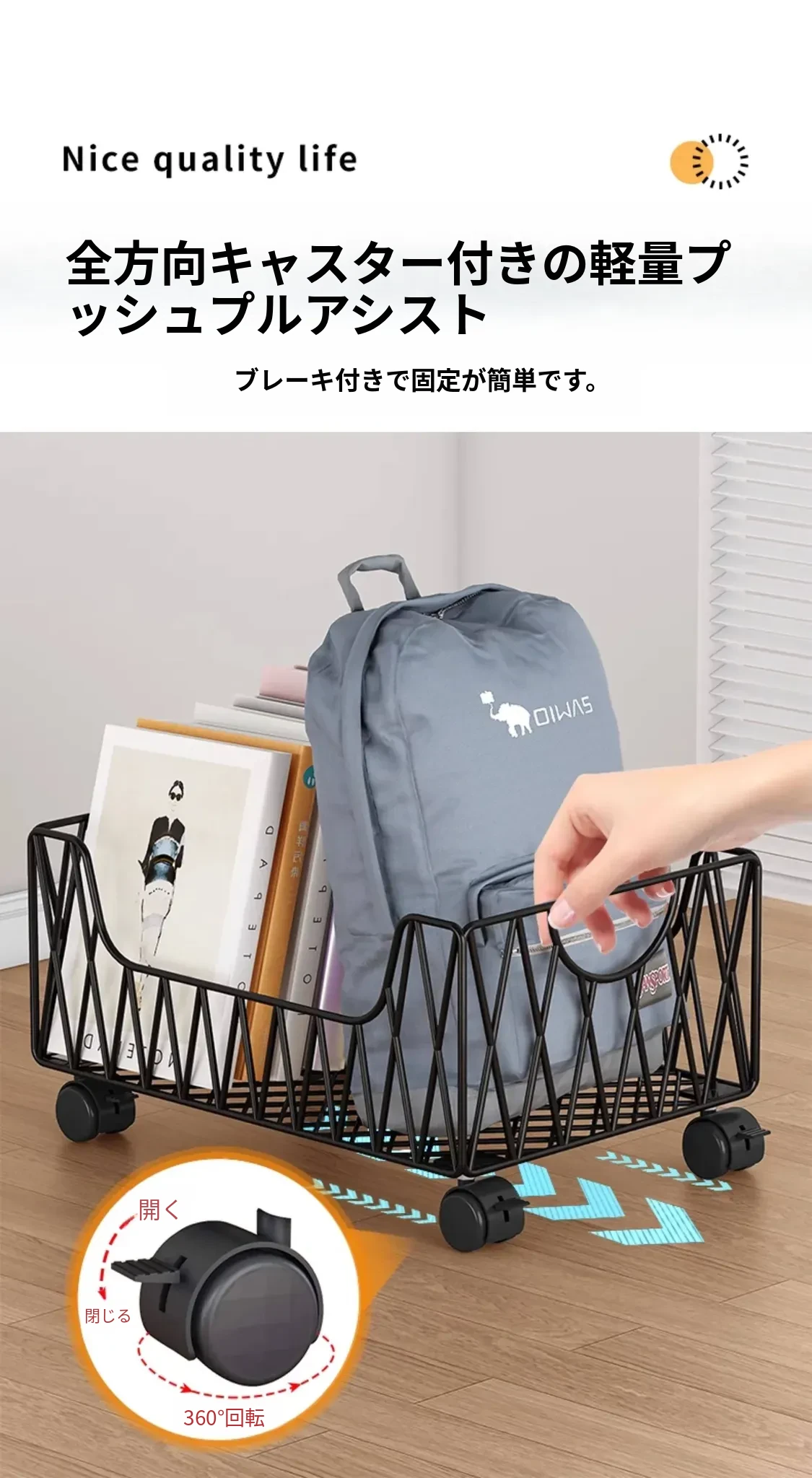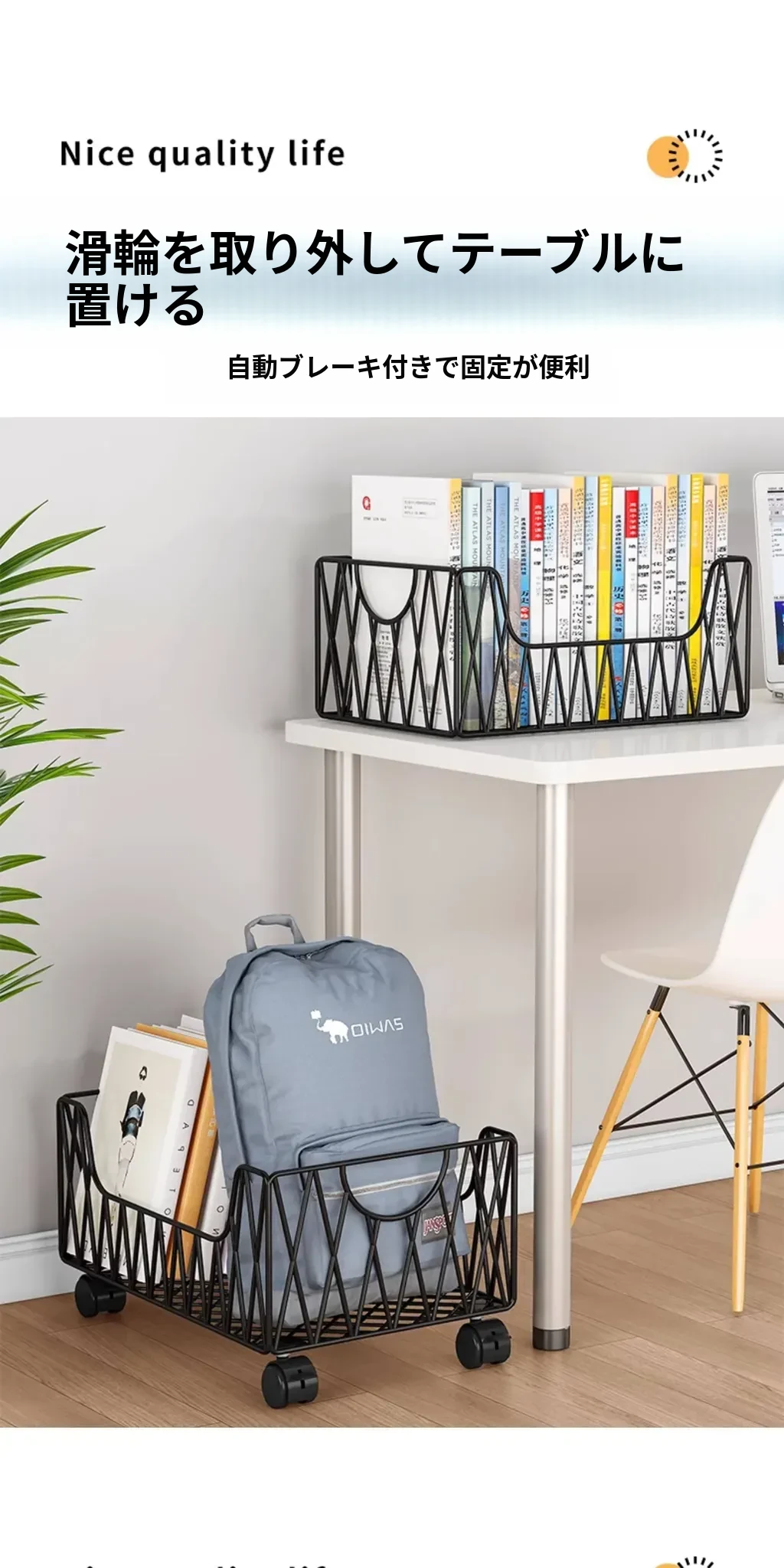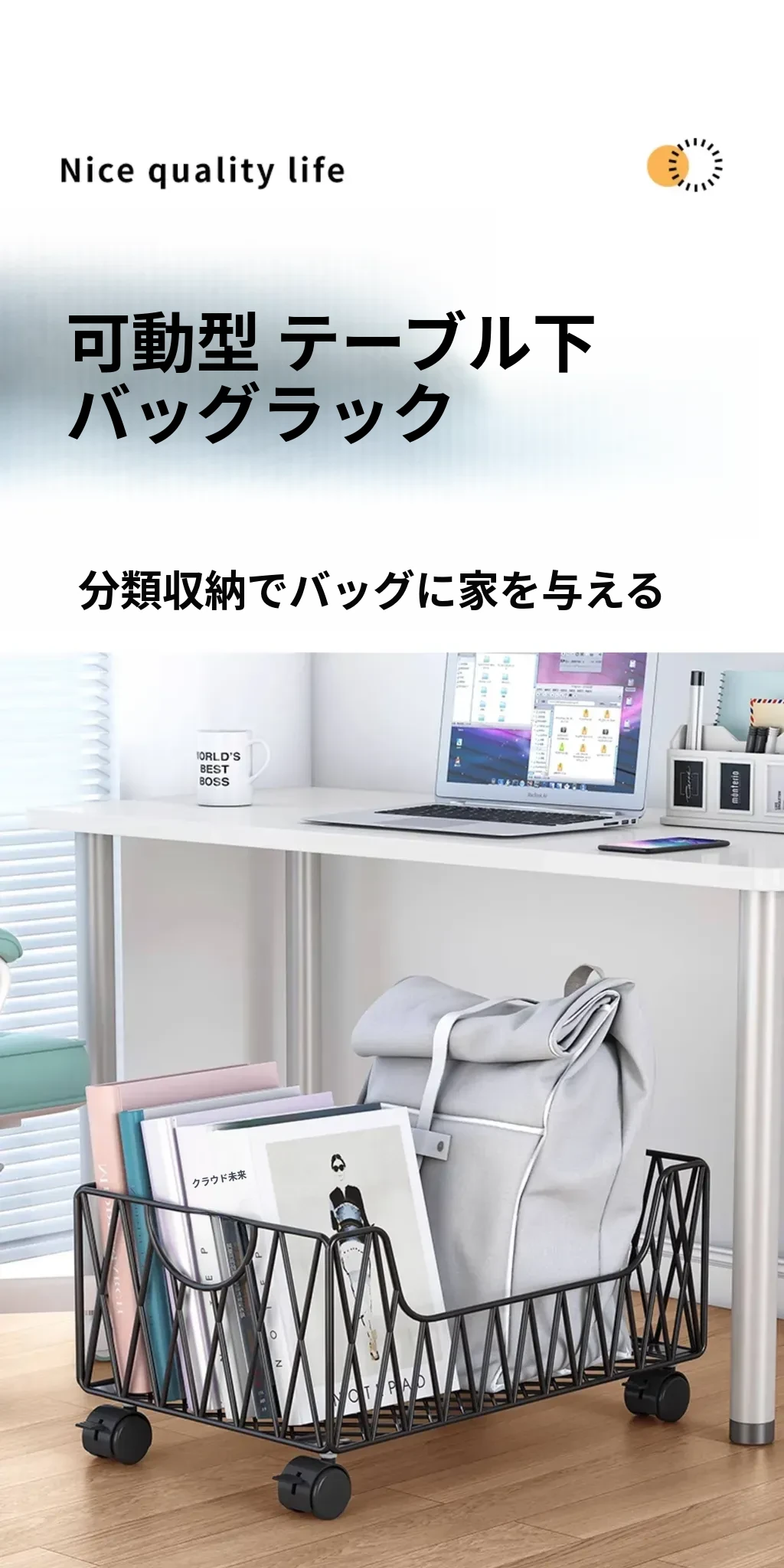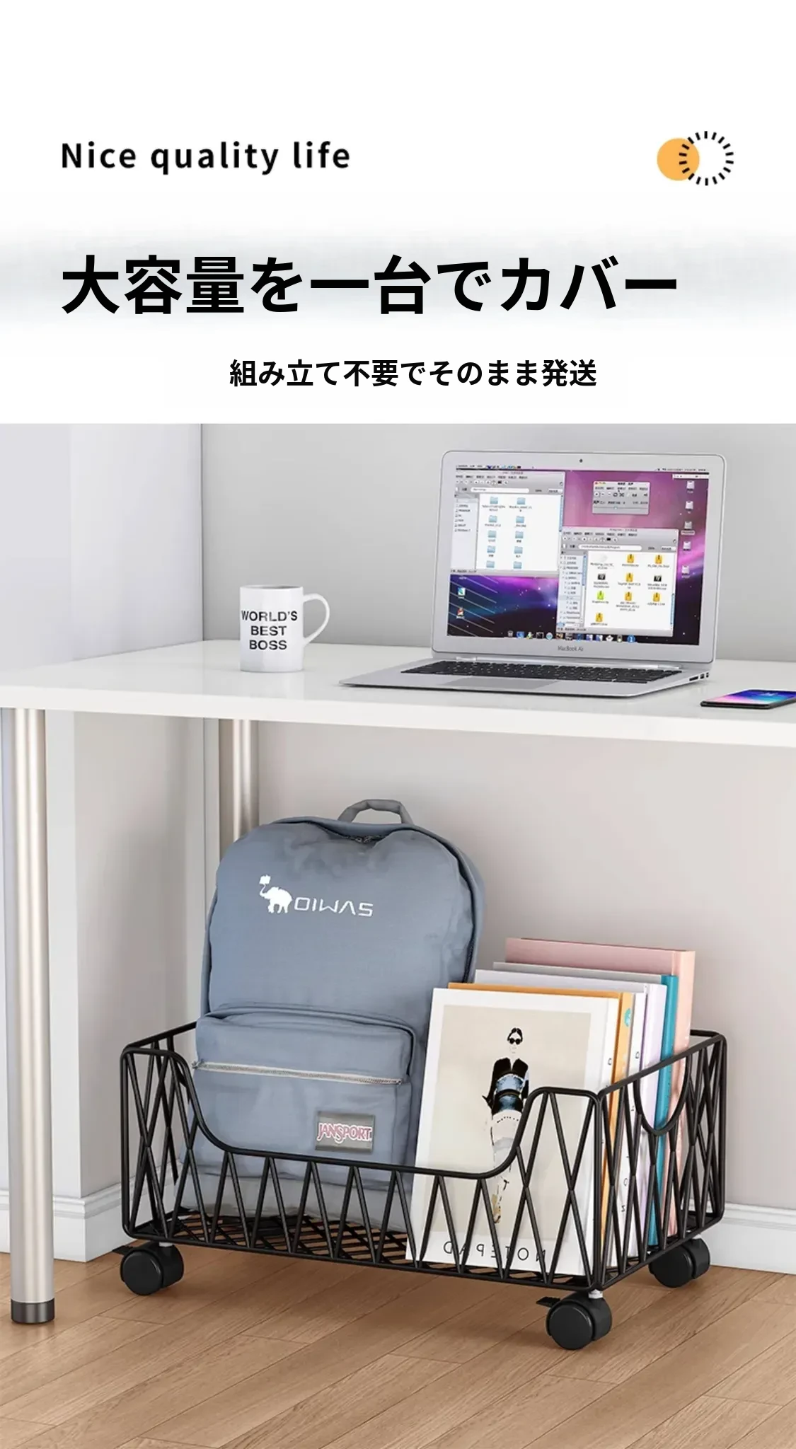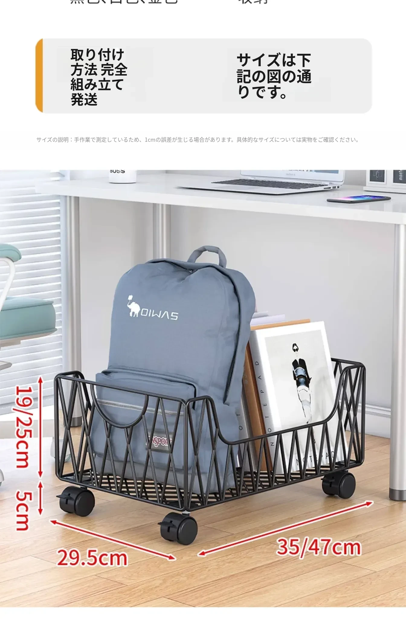 デスク周りスッキリ!移動可能なキャスター付き収納バスケット - オフィスの書籍やバッグを整理整頓する最適アイテム。デスク下にぴったり収まる便利な収納ボックス。