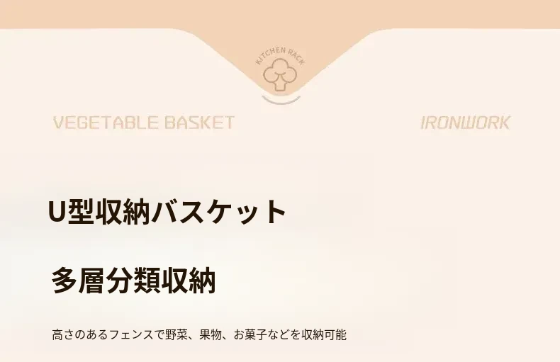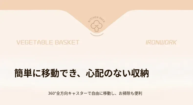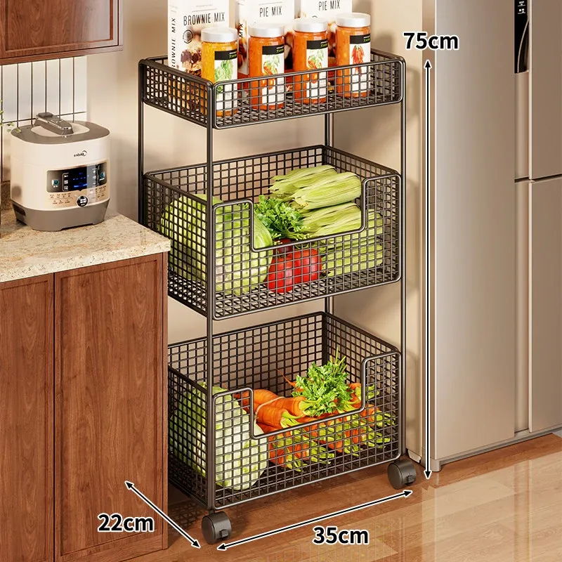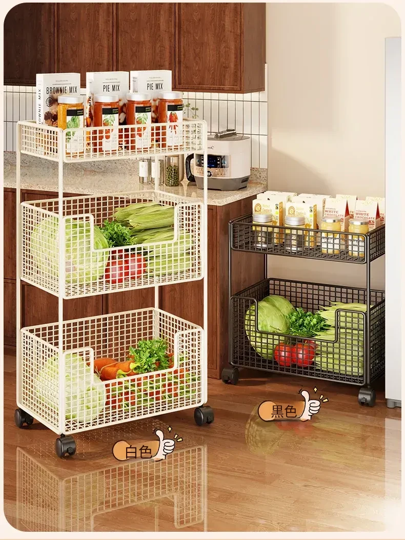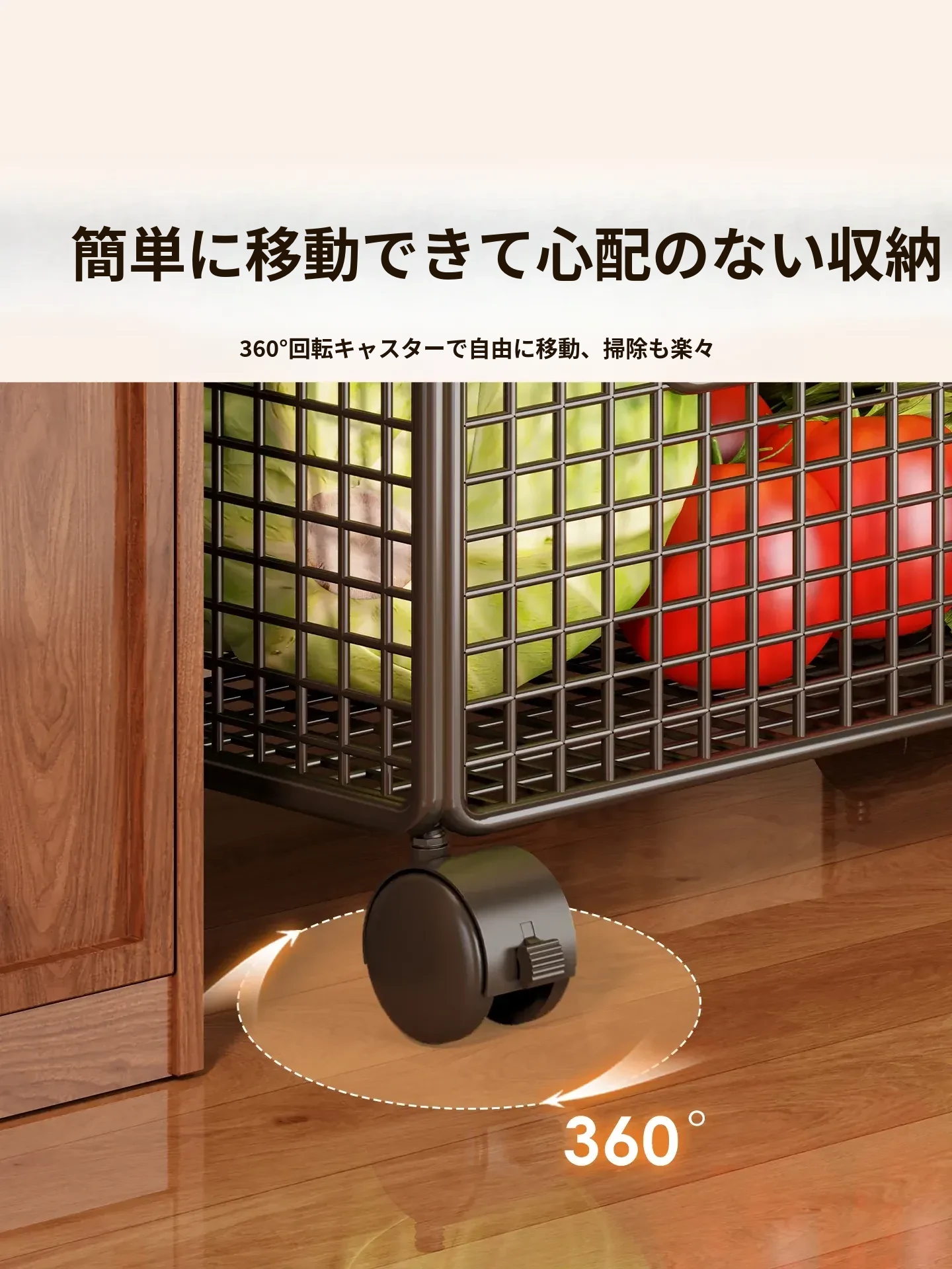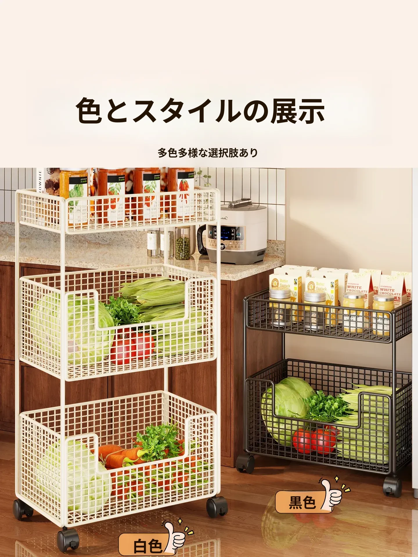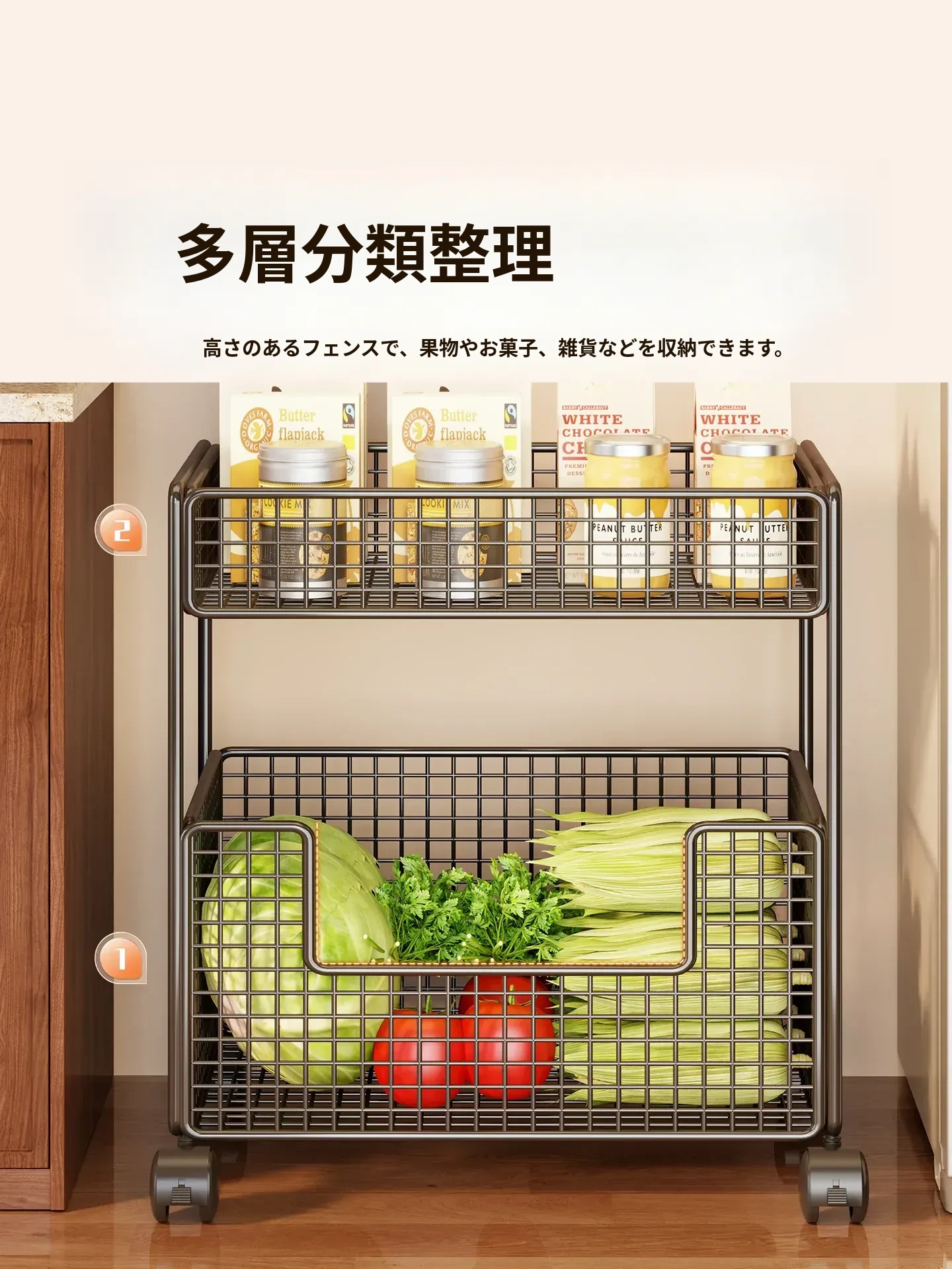 多機能キャスター付きキッチン収納ラック|野菜・果物用の多層バスケット|家庭用フロアスタンドで便利に収納!スッキリ整理できる小型ワゴンで、毎日の料理をもっと楽しく!