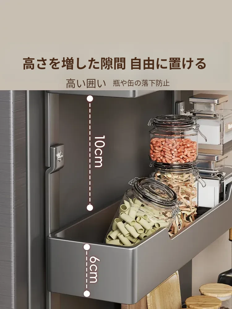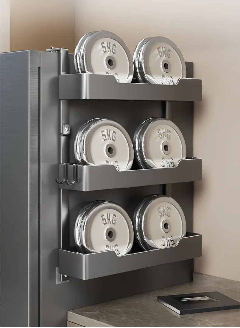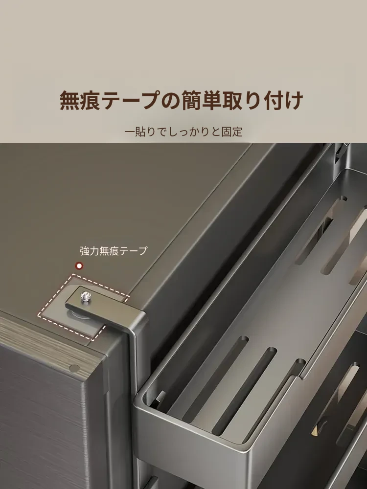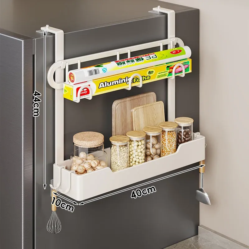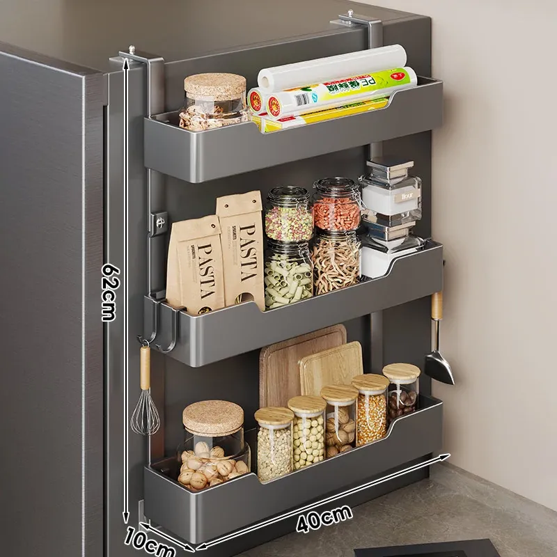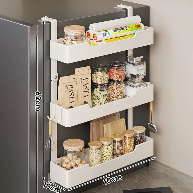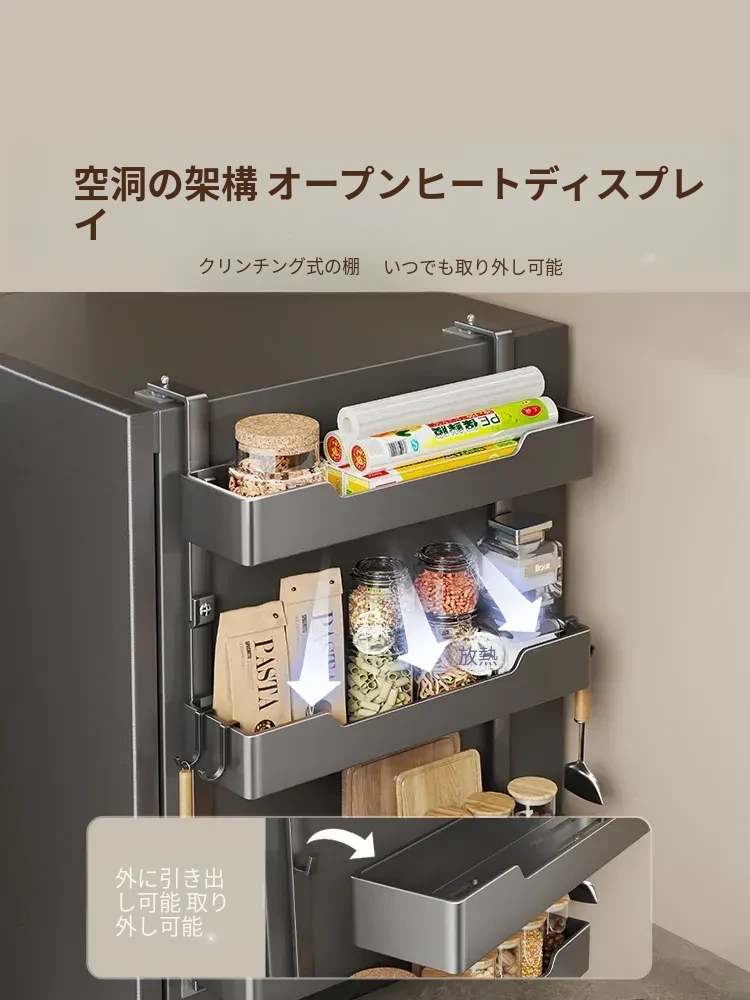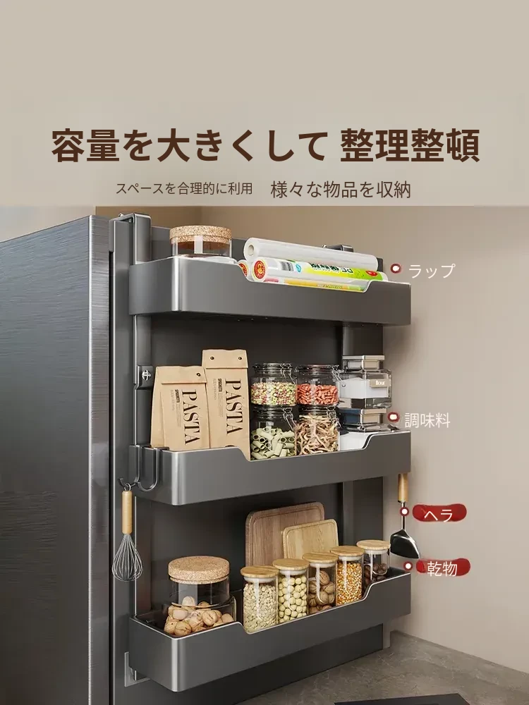 キッチンの必需品!多機能壁掛け収納ラック - 冷蔵庫横にぴったりフィット!調味料やラップをスッキリ整理、家事をもっと楽に。省スペースで使いやすい多層設計で、毎日の料理をサポートします!
