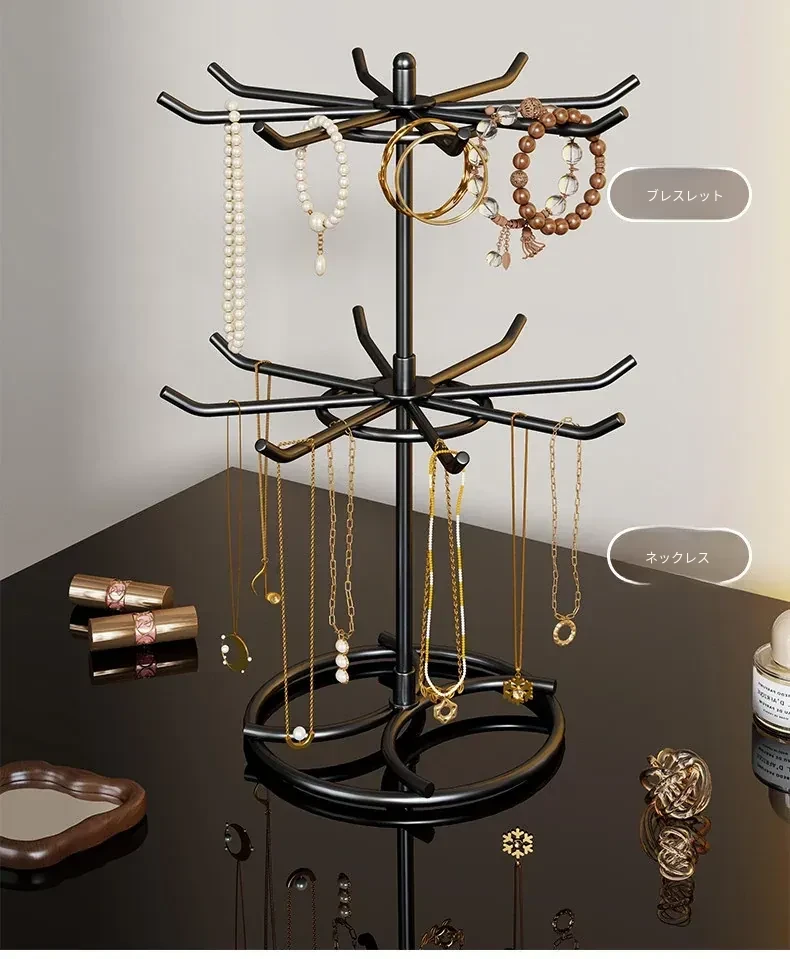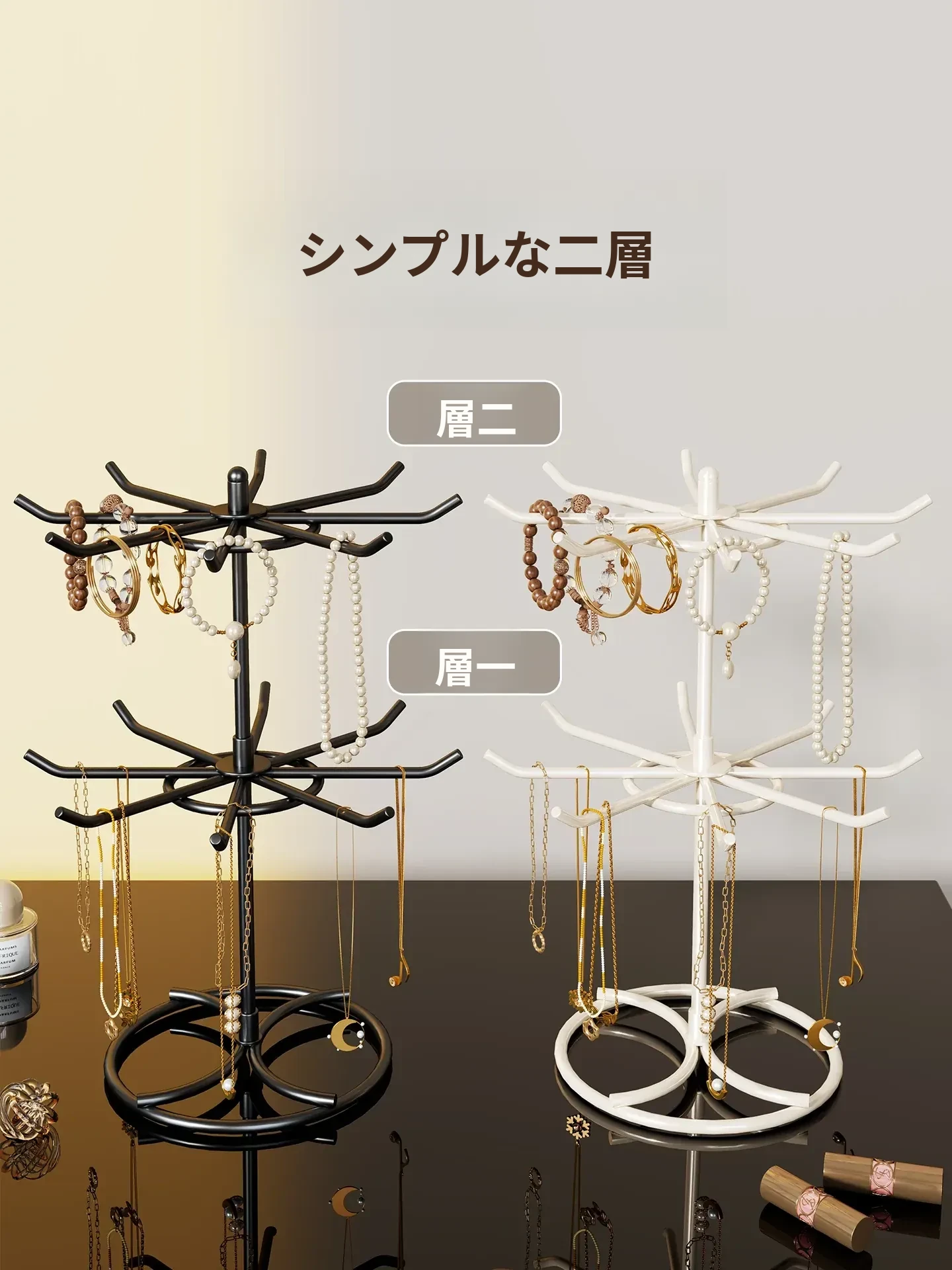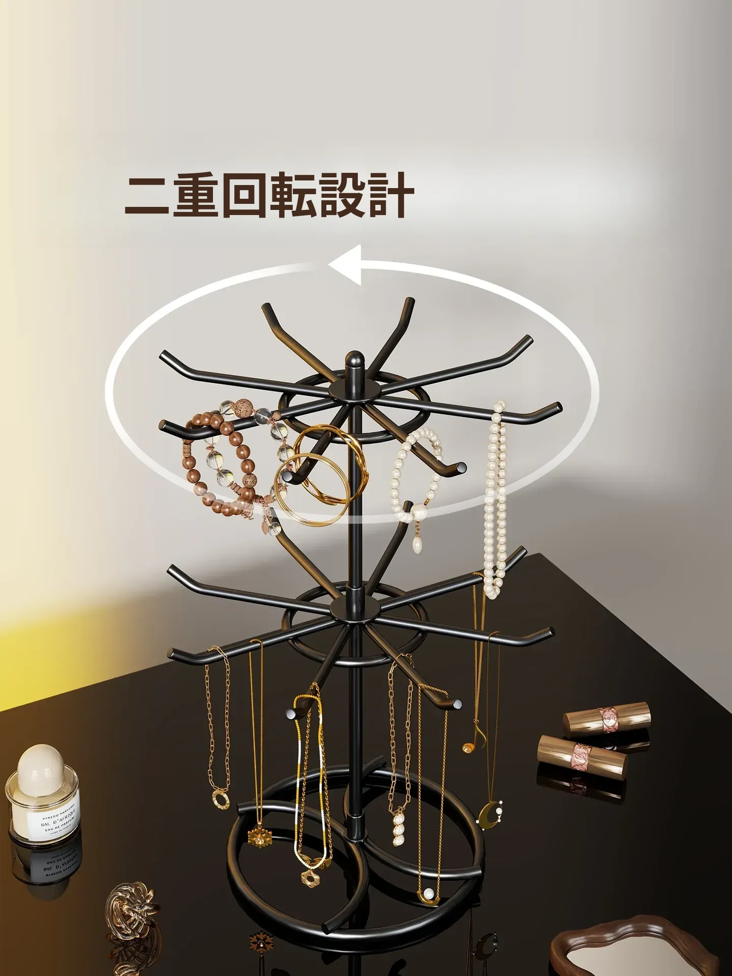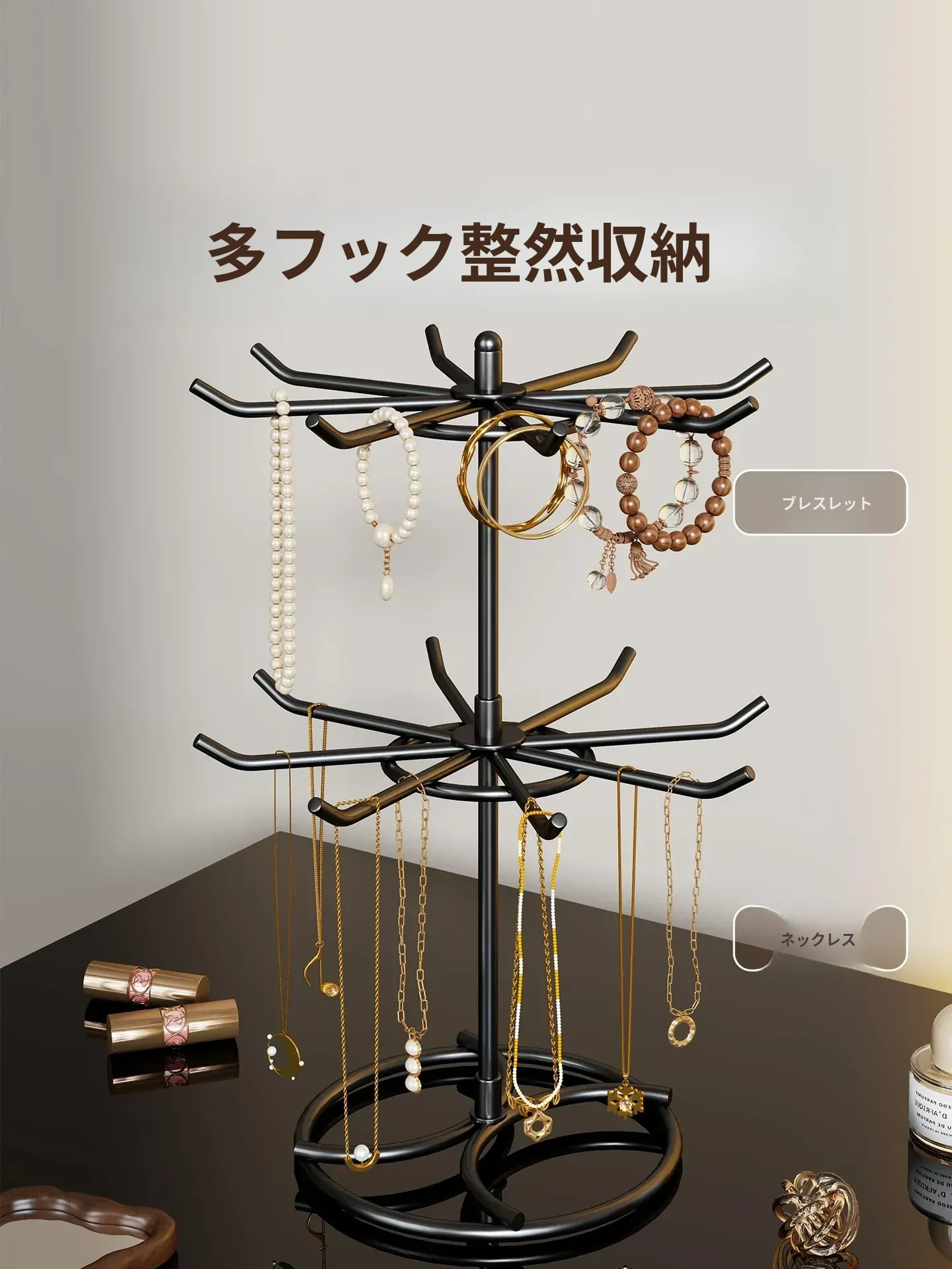 回転式ネックレス収納スタンド - デスクトップ用のブレスレット・イヤリング・小物ディスプレイラック、スマホチェーンも掛けられるおしゃれな整理整頓アイテム!