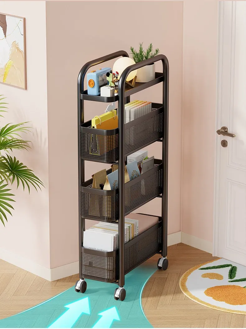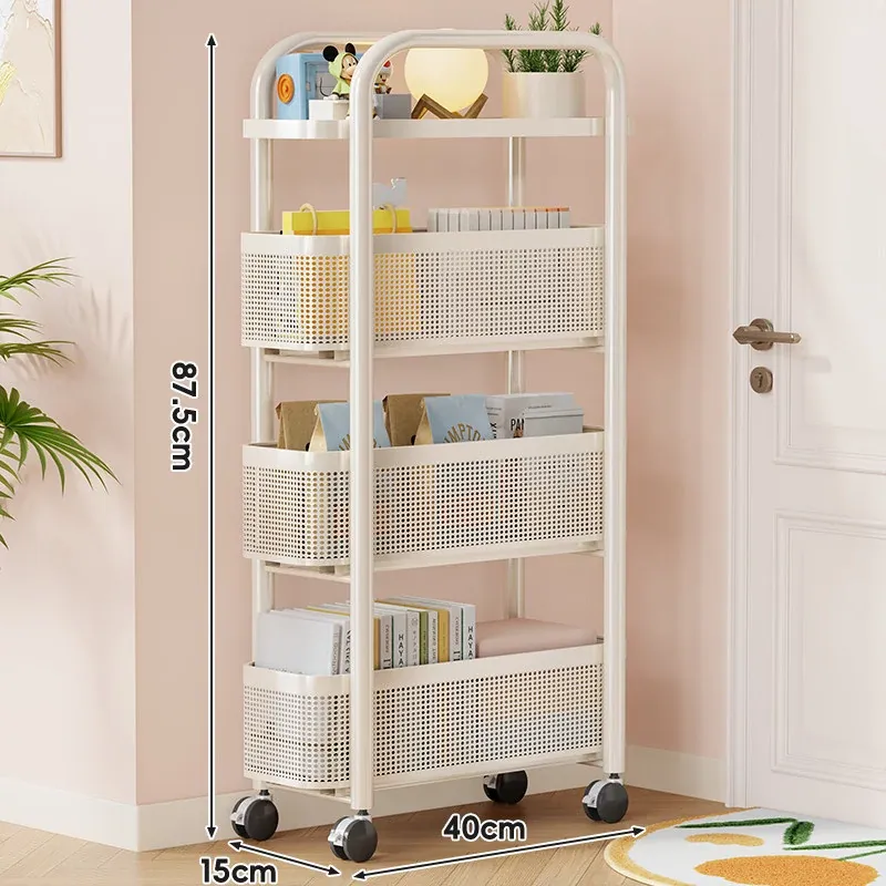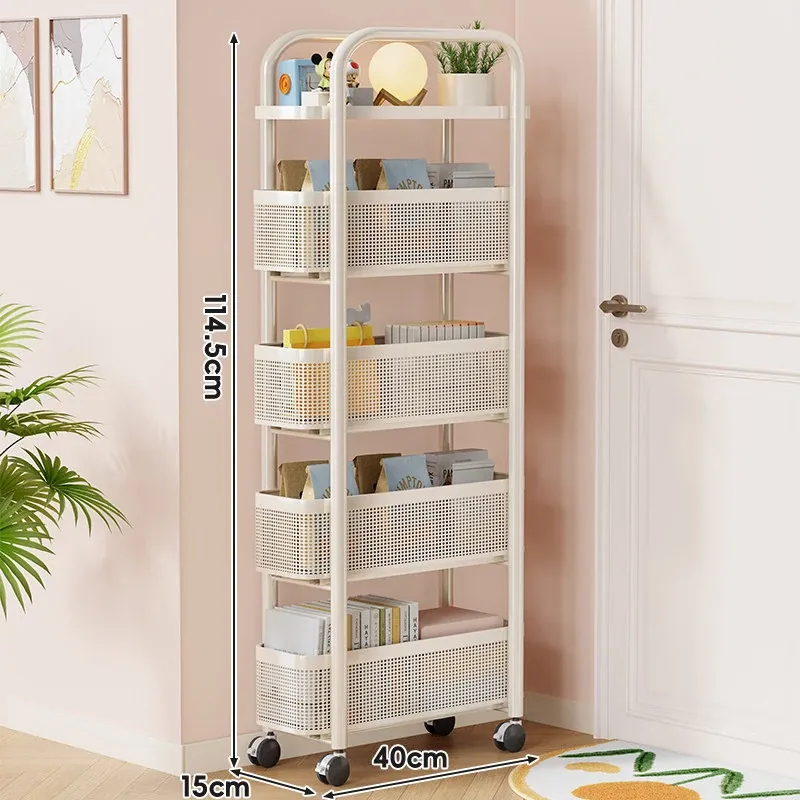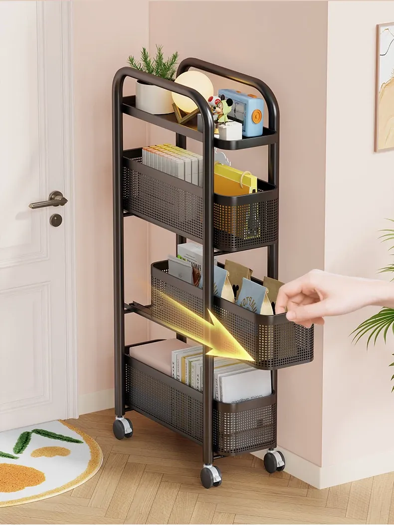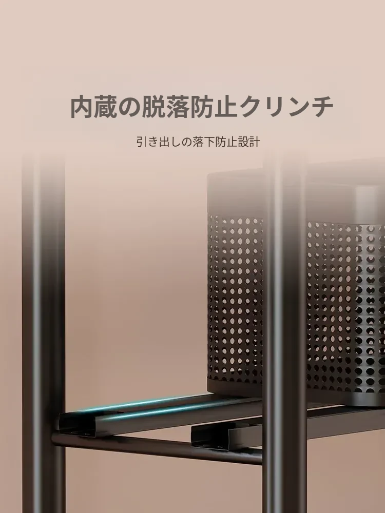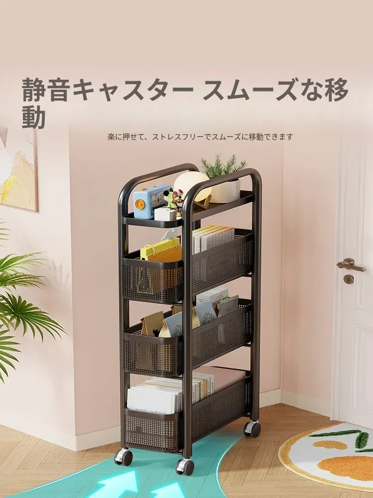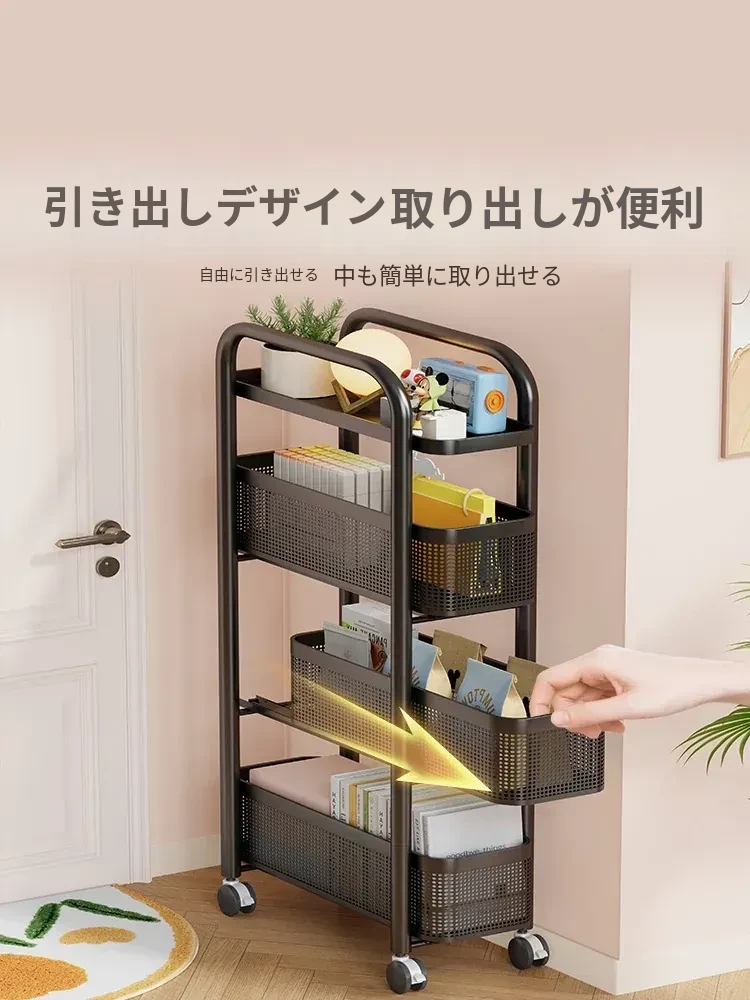 隙間収納ラック - 寝室やキッチン、洗面所のドアの後ろにぴったりフィット!スリムなデザインで引き出し式のカゴ付き、スナックや小物をスッキリ収納!省スペースでおしゃれな小推車です。