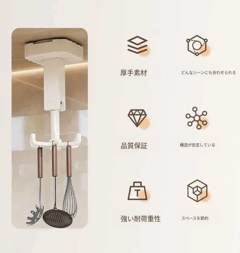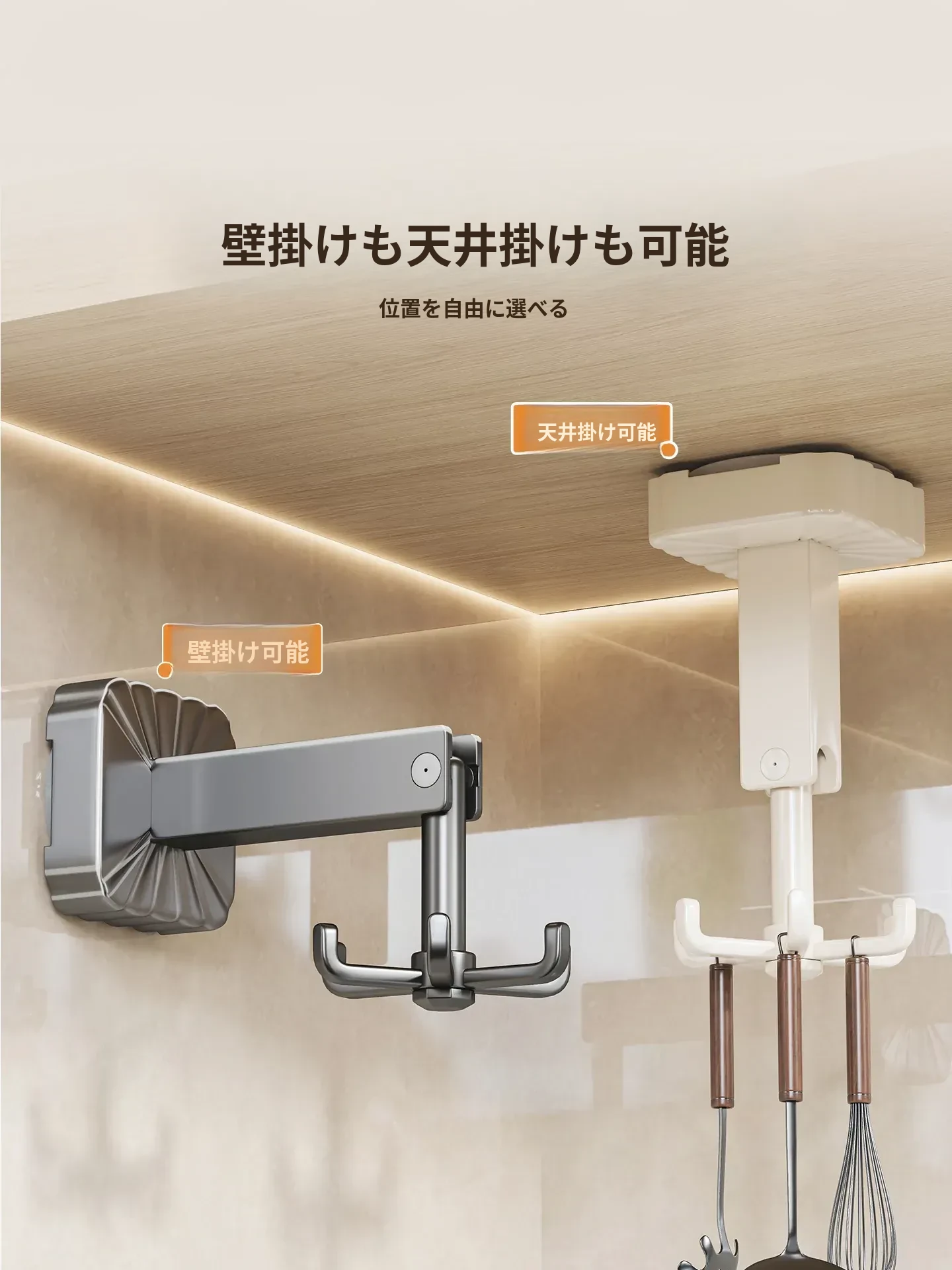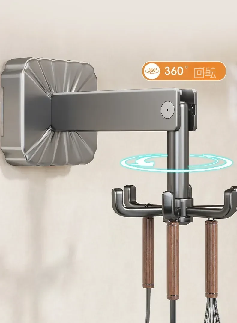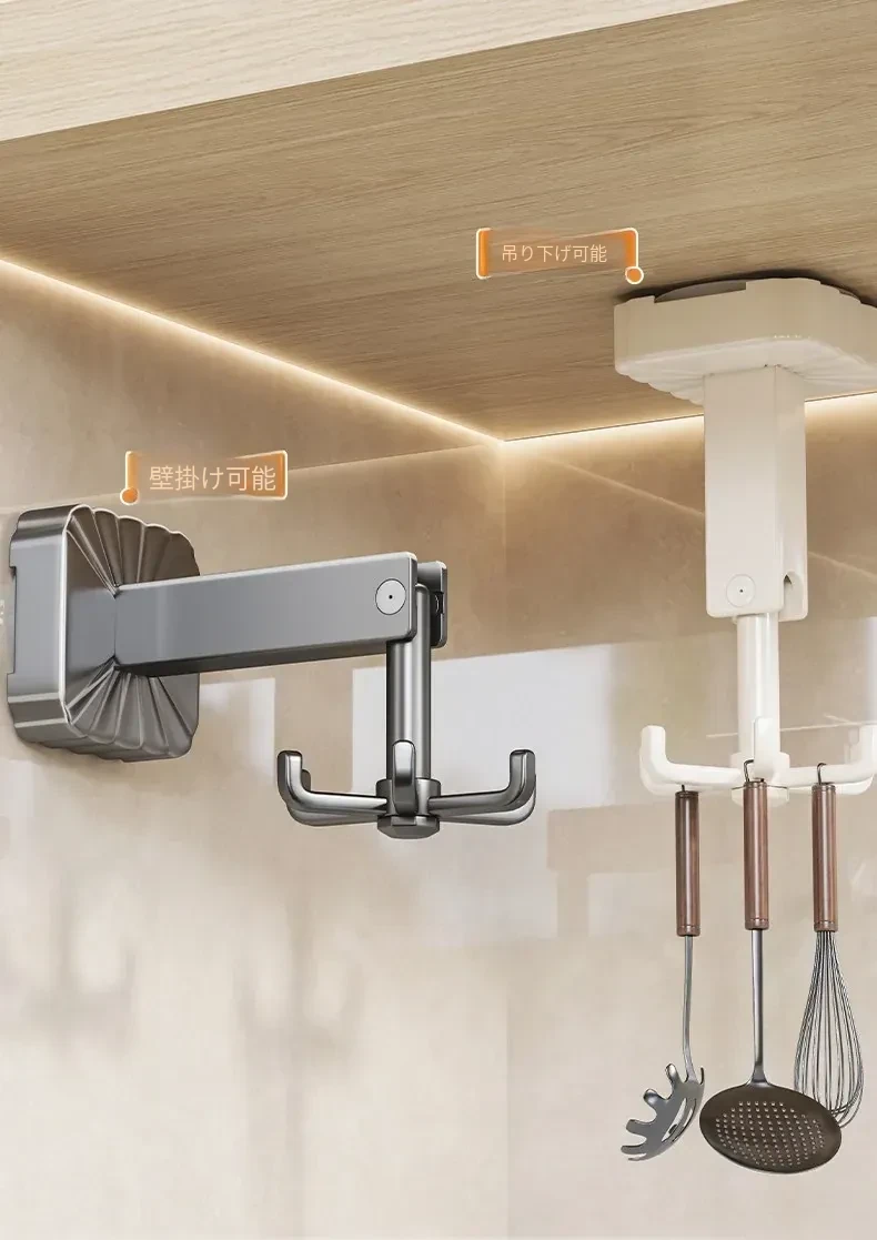 吸盤式キッチン回転フック - 穴なし壁掛け鍋やお玉収納ラック!家事を楽にする便利アイテム、スペースを有効活用してスッキリ整理整頓!