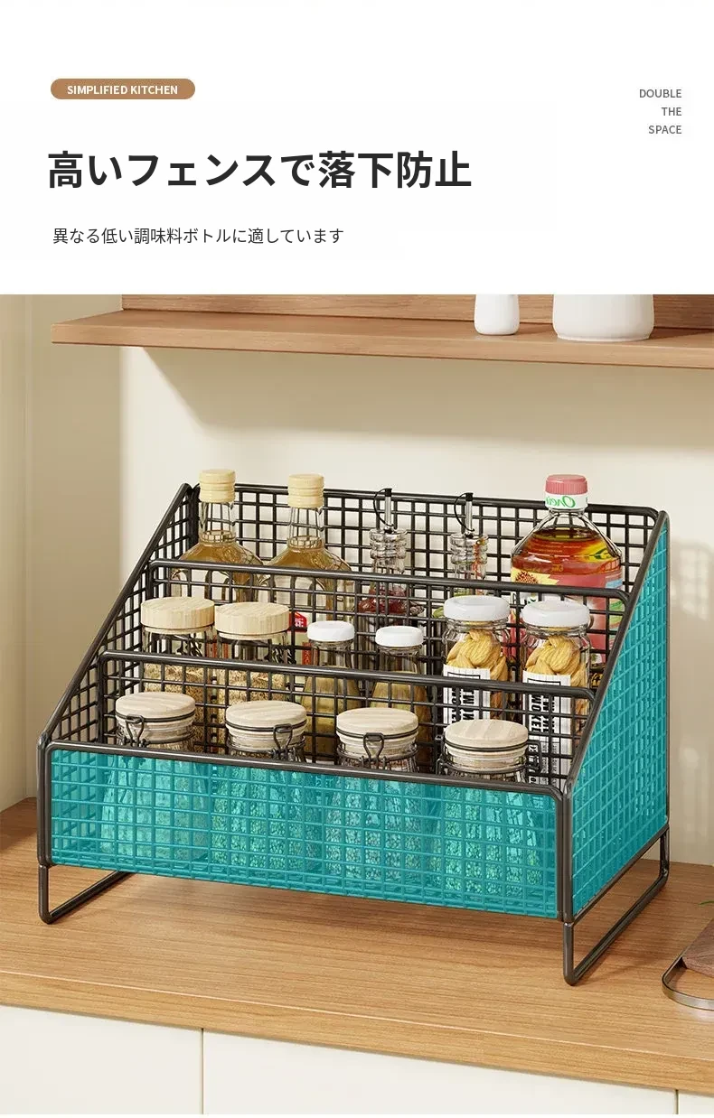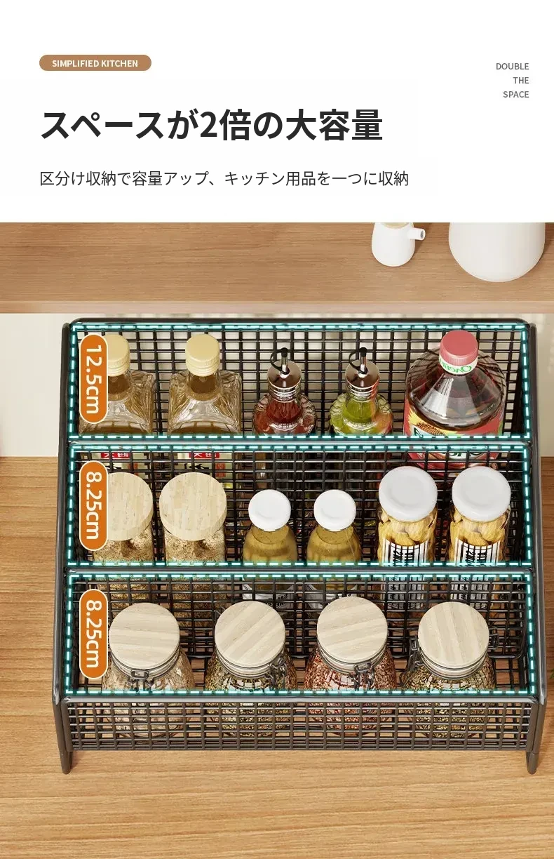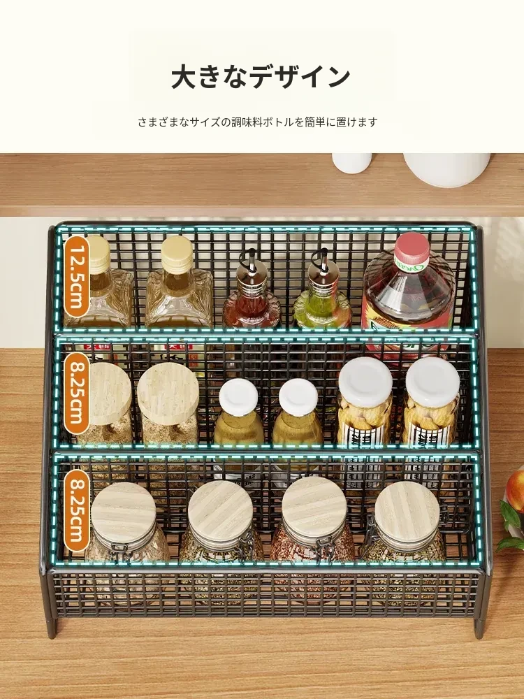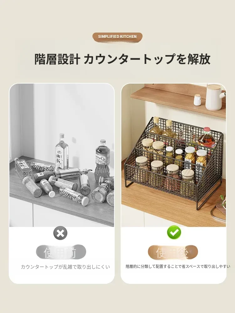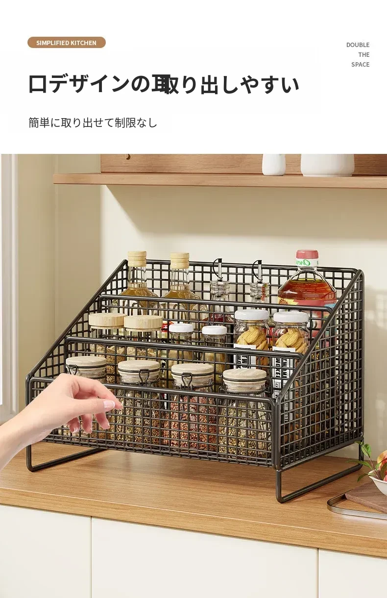 多機能調味料収納ラック|キッチンにぴったりの整理整頓アイテム!カップホルダー付きで、スッキリとした台面を実現。調味料を美しく分けて収納し、料理をもっと楽しく!
