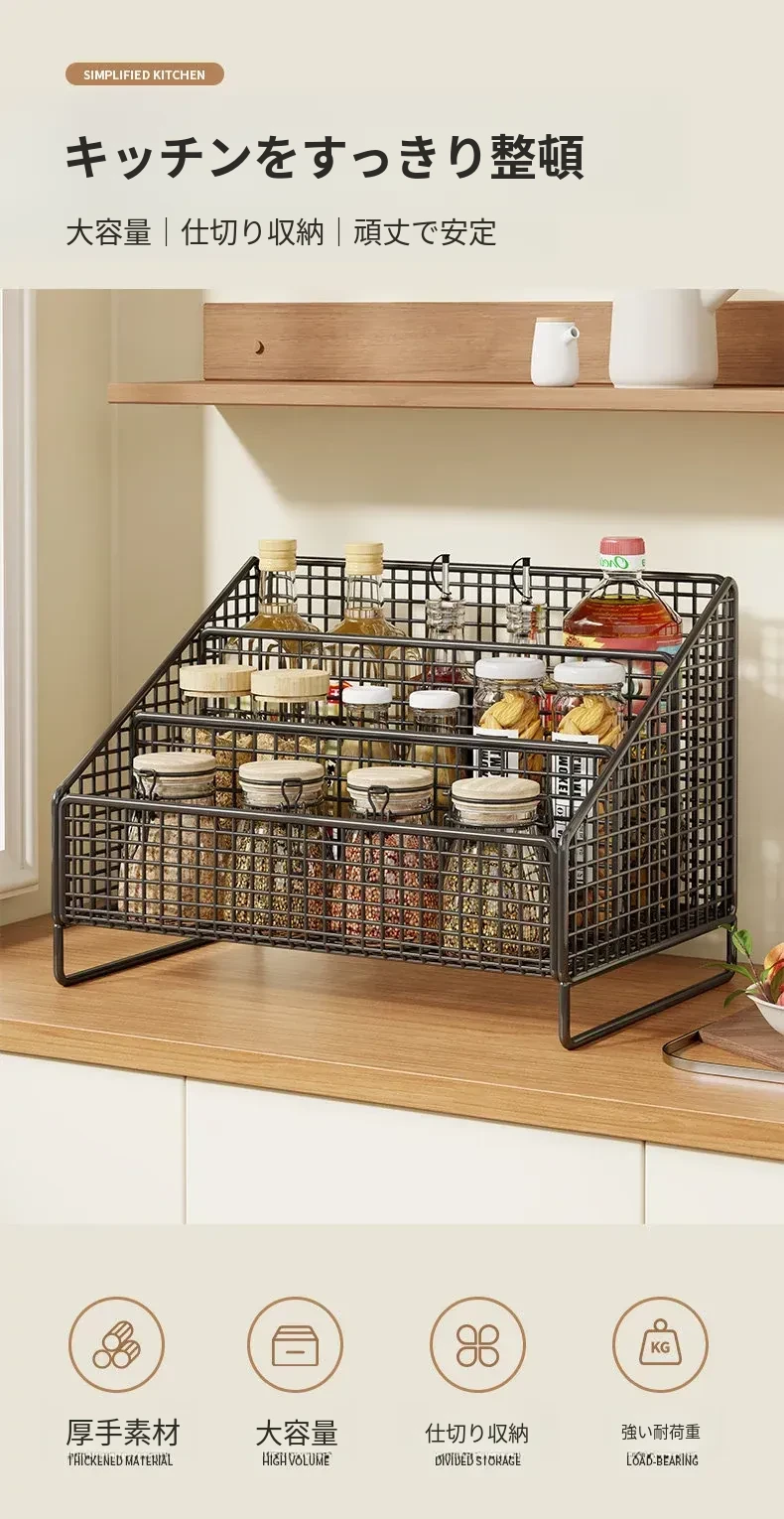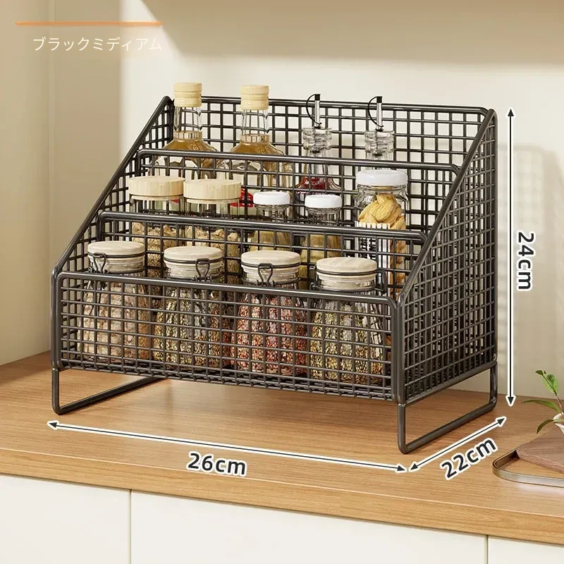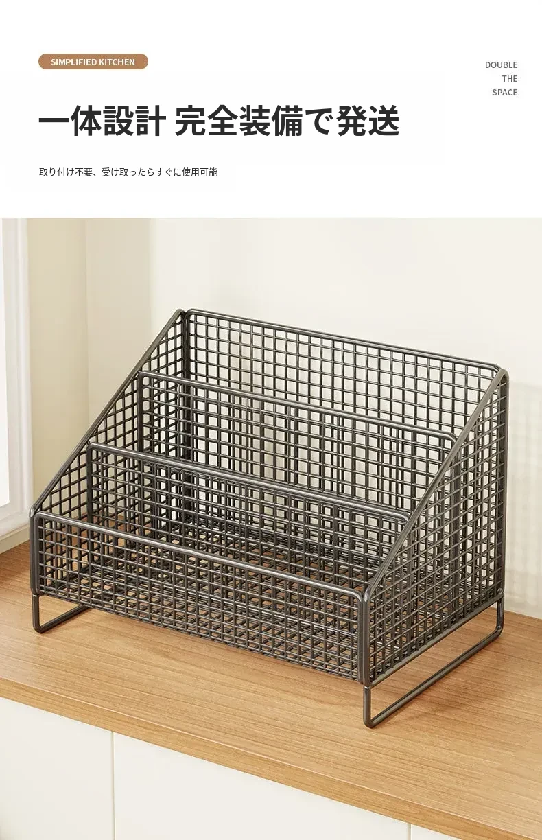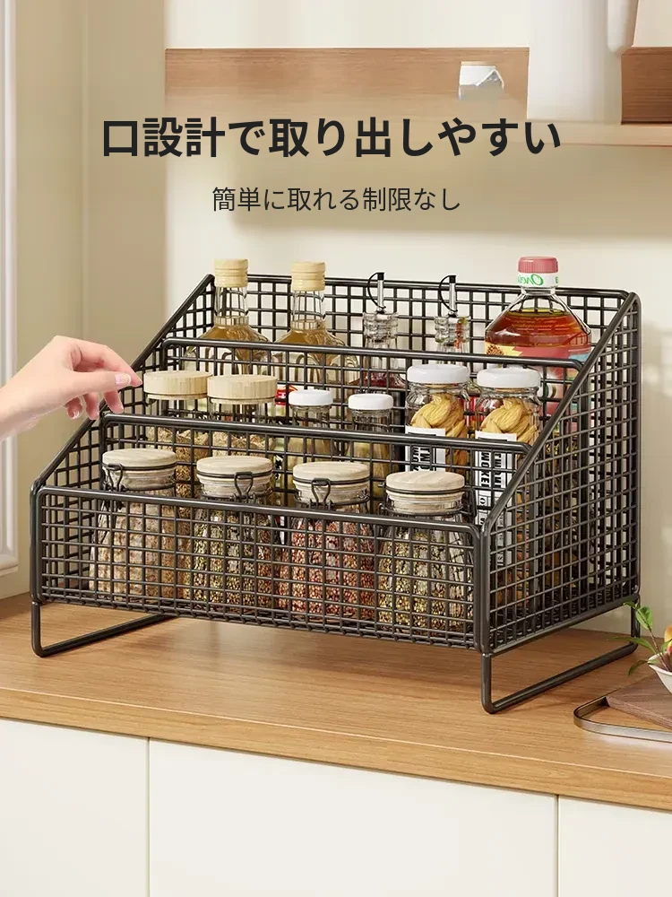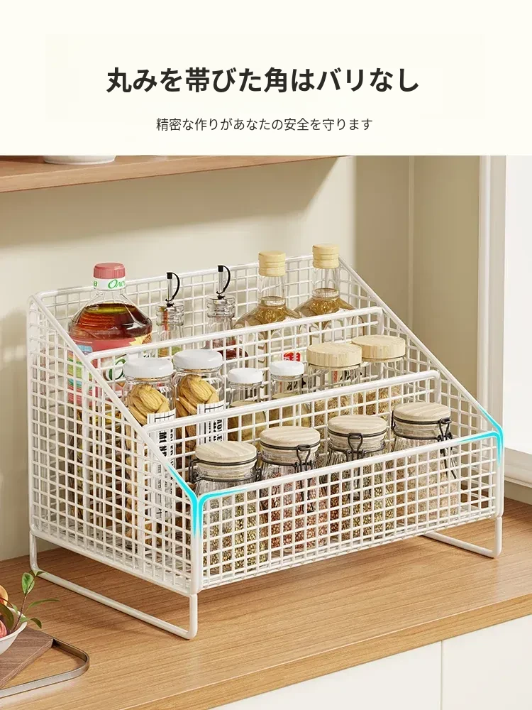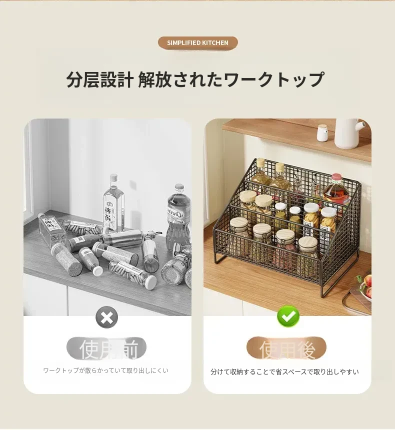 多機能調味料収納ラック|キッチンにぴったりの整理整頓アイテム!カップホルダー付きで、スッキリとした台面を実現。調味料を美しく分けて収納し、料理をもっと楽しく!