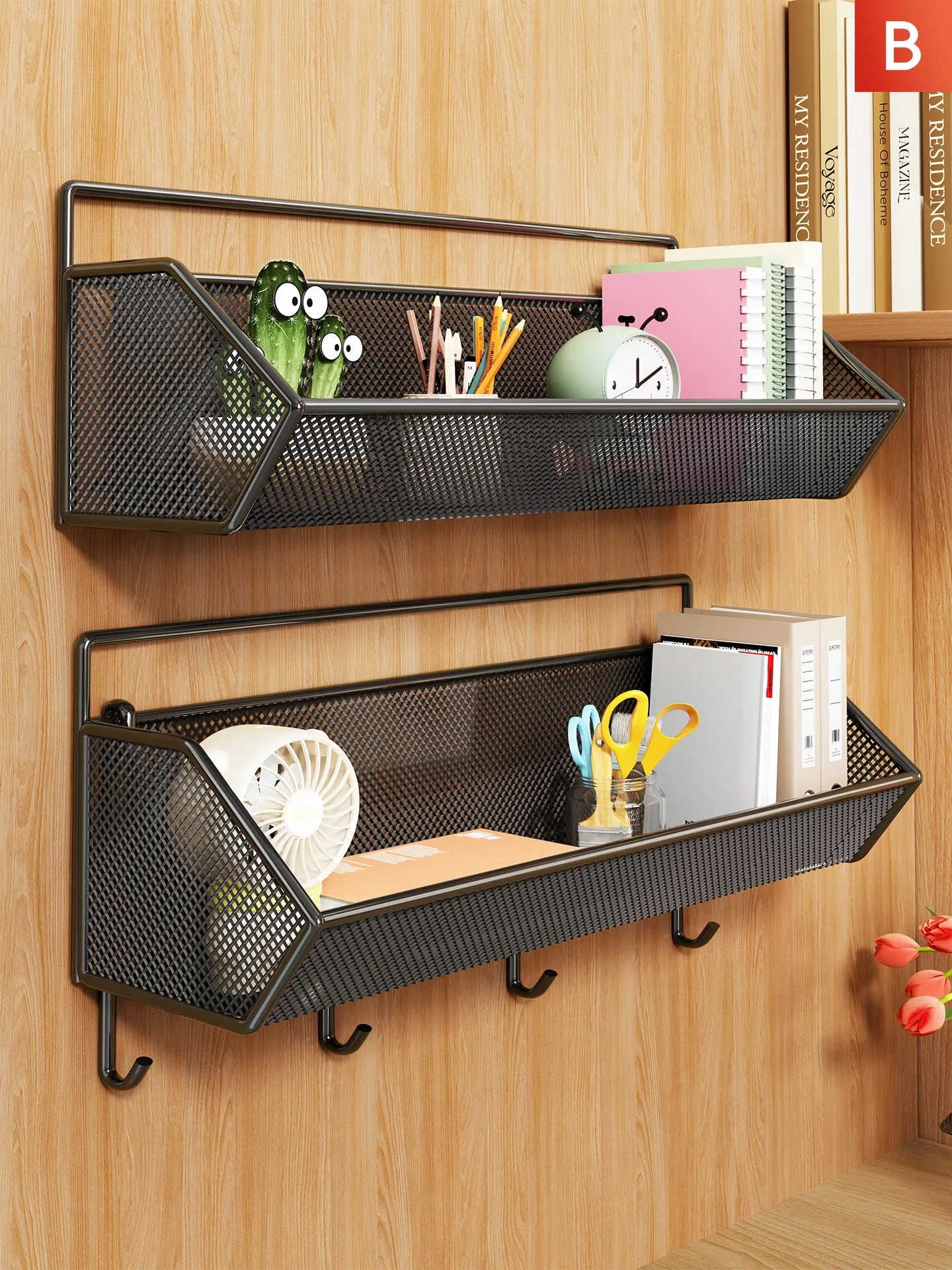 オフィスデスク用収納ラック - 壁掛け式で大容量、デスク周りをスッキリ整理!穴あけ不要の便利フック付きで、どんなスペースにもフィットするデザイン。仕事効率をアップさせる必需品!