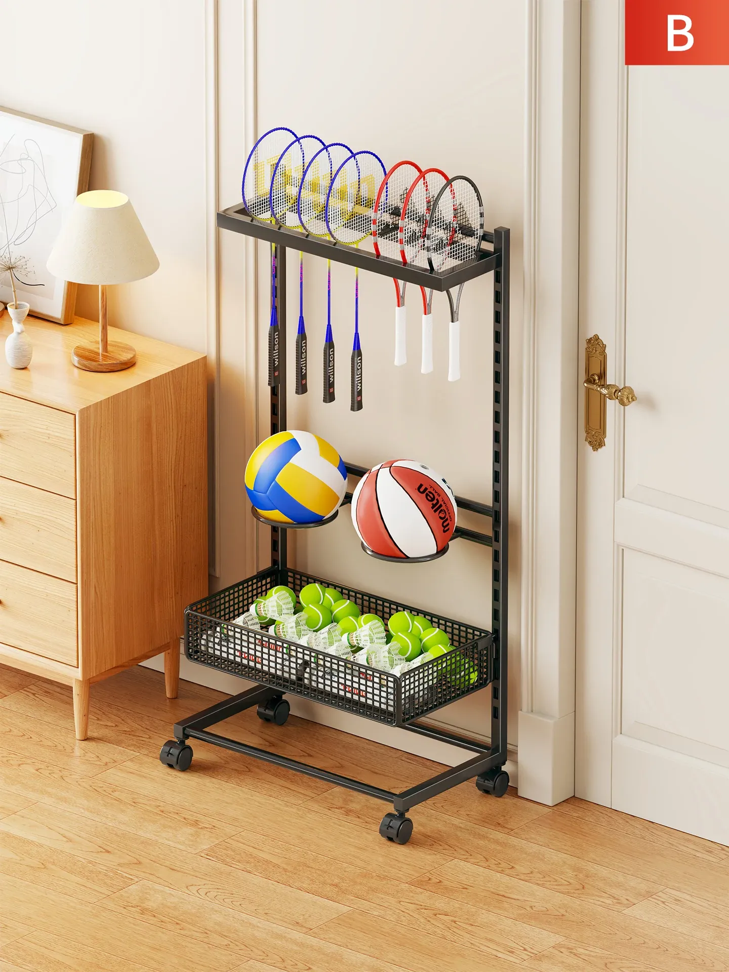 移動式フィットネス器具収納ラック - 大容量で便利!バドミントンやヨガマットもすっきり整理できるキャスター付き収納ボックス。家庭での使用に最適!